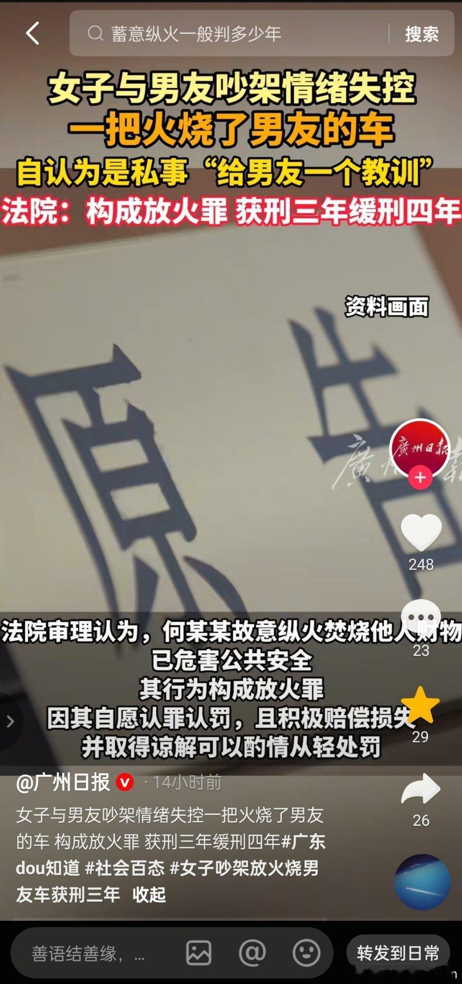 女子与男友吵架情绪失控。一把火烧了男友的车。自认为是私事,“给男友一个教训”。构成放火罪,获刑三年缓刑四年。