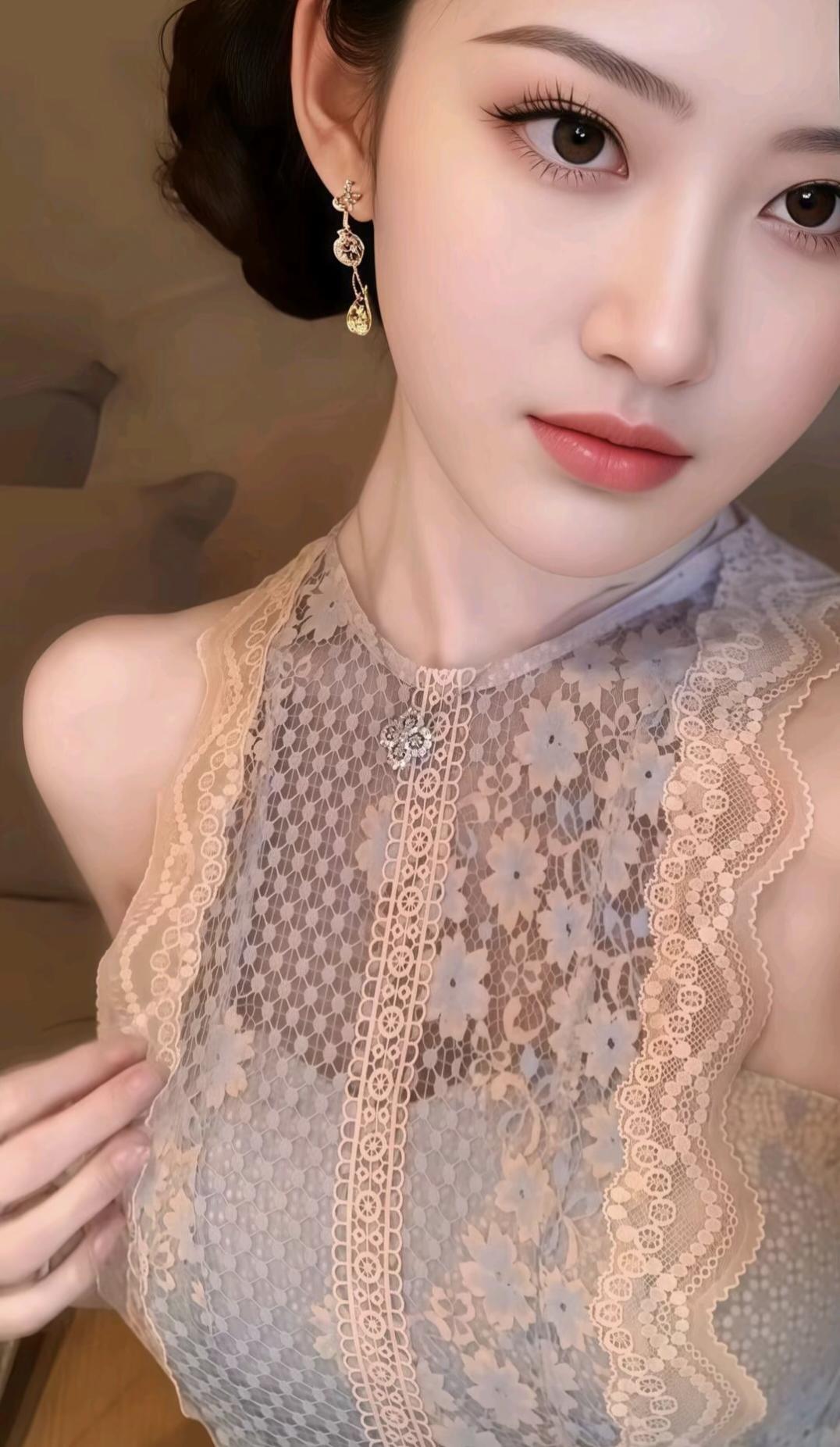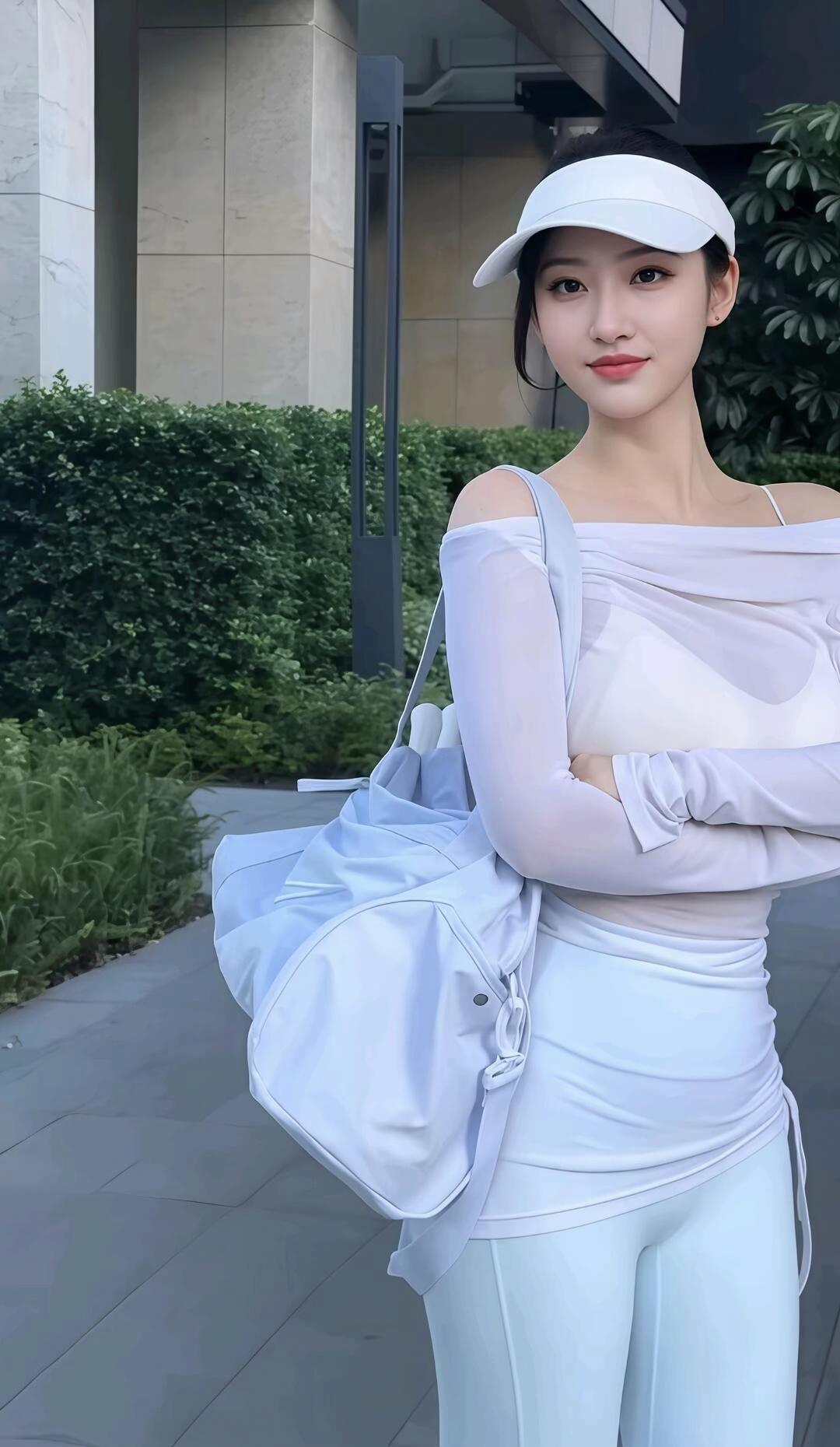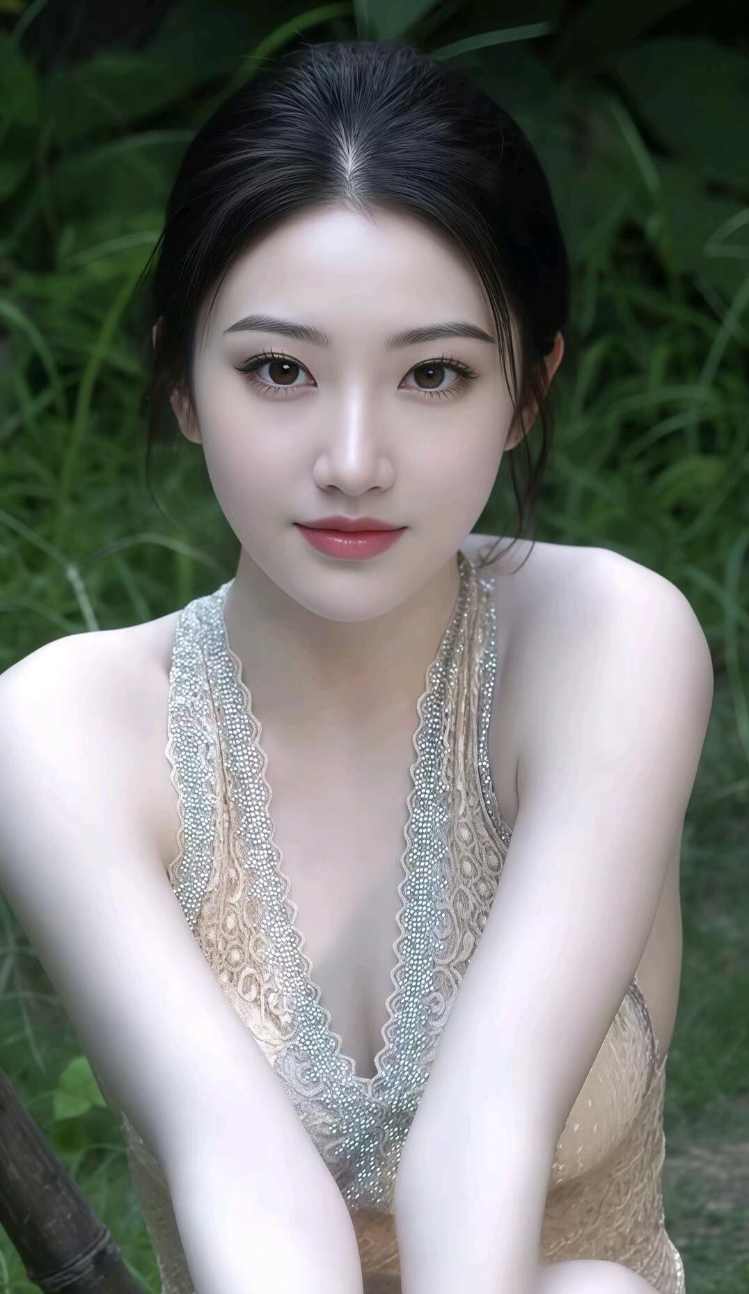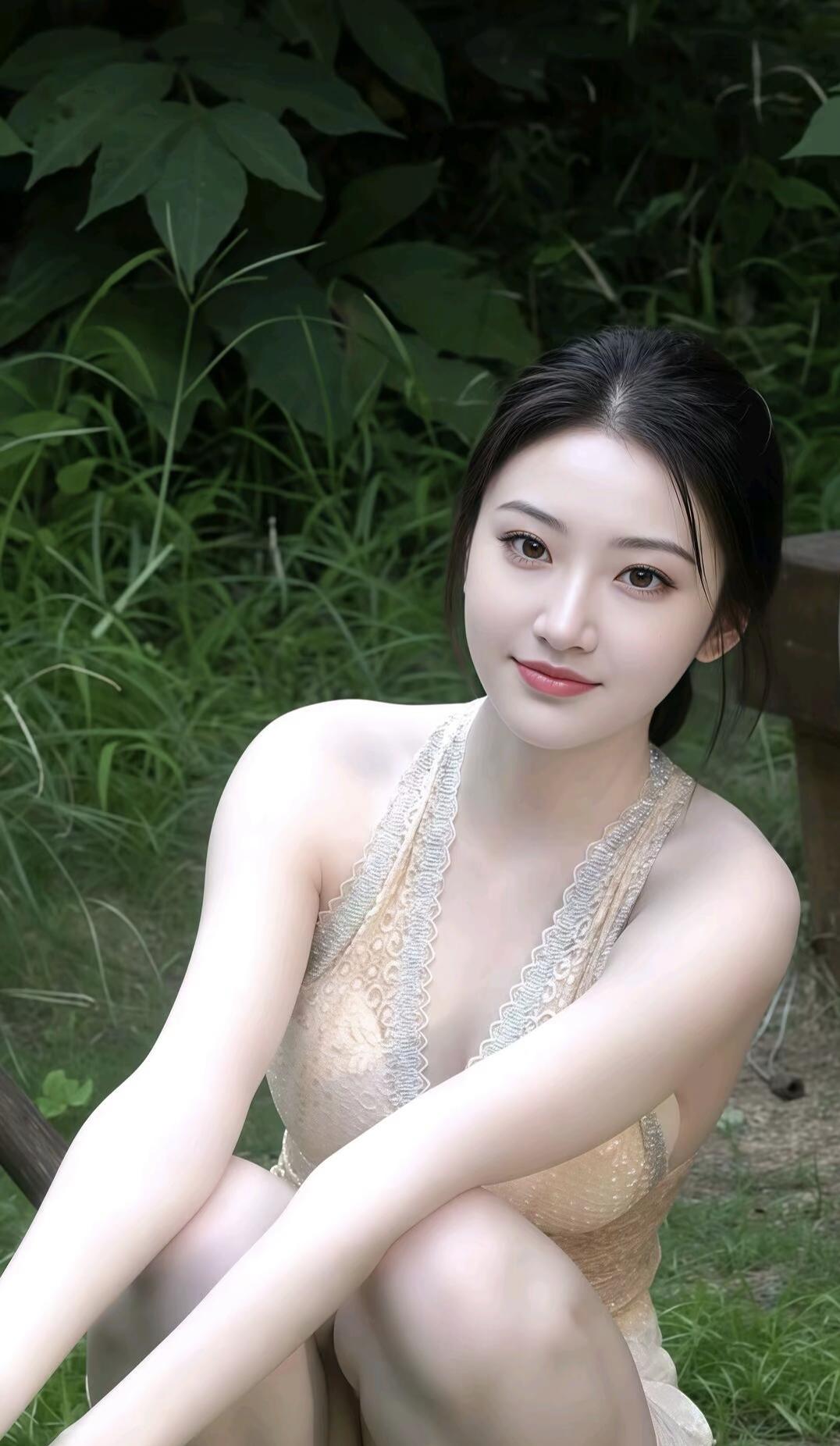 绿树掩映中,佳人倚栏立。礁石花影佳人