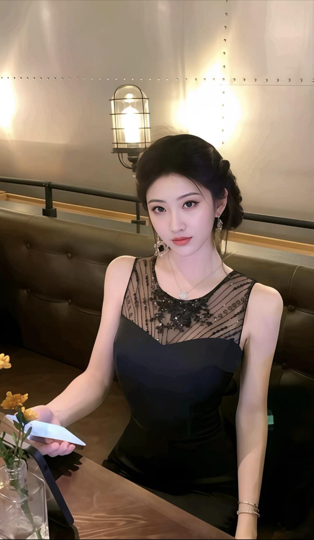 绿树掩映中,佳人倚栏立。礁石花影佳人