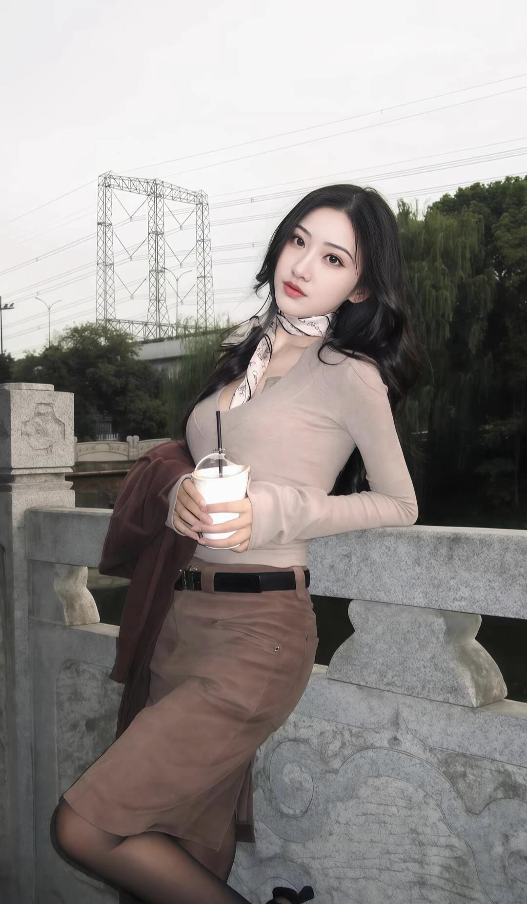 黑衣美人倚栏立,风姿绰约似画卷。