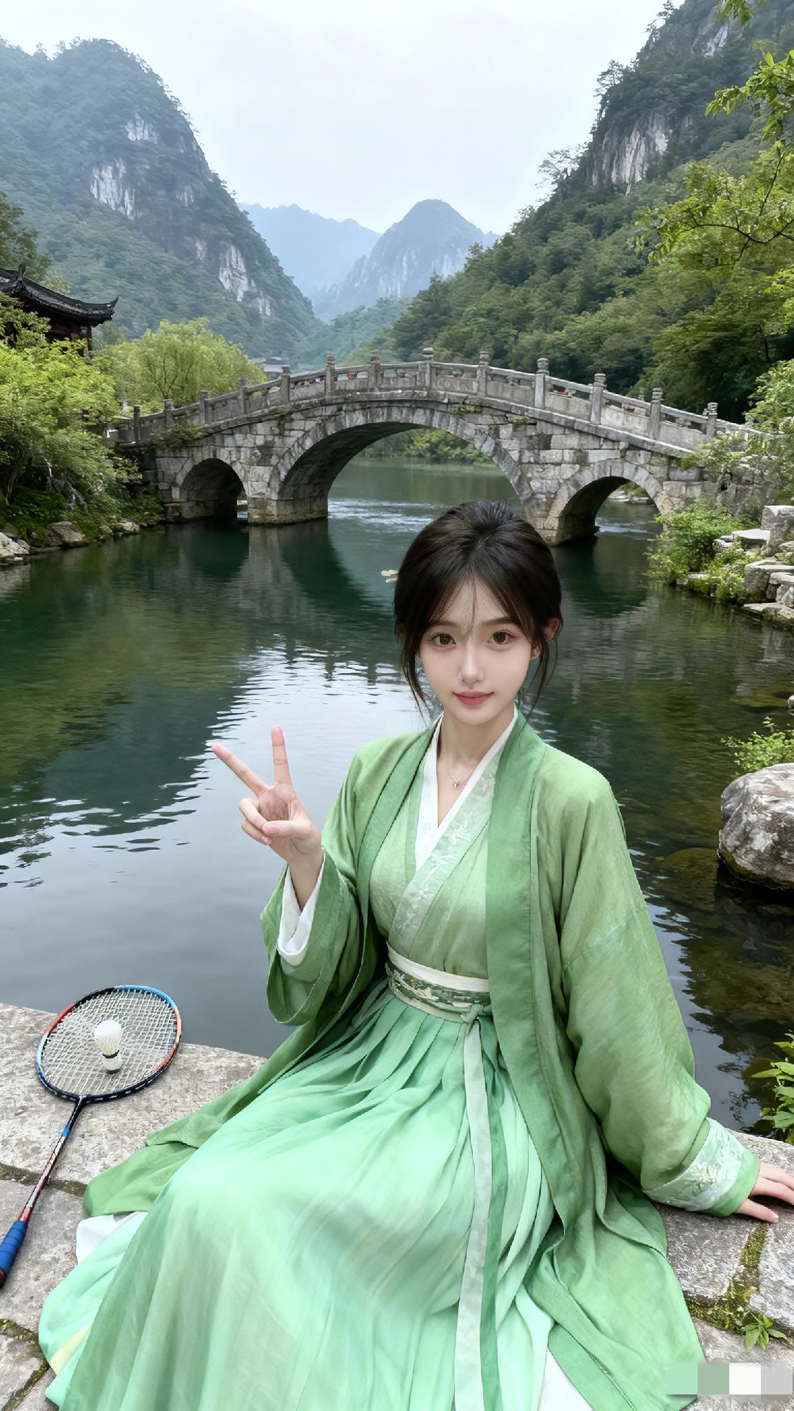 救命!这是什么从古风漫画里走出来的神仙妹妹啊! 穿腻了运动装?不如试试把汉服焊在身上——清透薄荷绿纱衫配渐变裙,像把一整个春天的竹林都裹在了身上,又仙又衬肤色! 坐在水边比耶的样子,又甜又灵,发梢的碎发都在发光✨ 身后的石桥青山像从水墨画里抠出来的。 这才是中式审美天花板吧!既有汉服的温婉,又有少女的元气,谁看了不说一句“想跟着穿汉服去春游”!你觉得汉服好看吗?中国风仙女汉服 汉服裙裙子