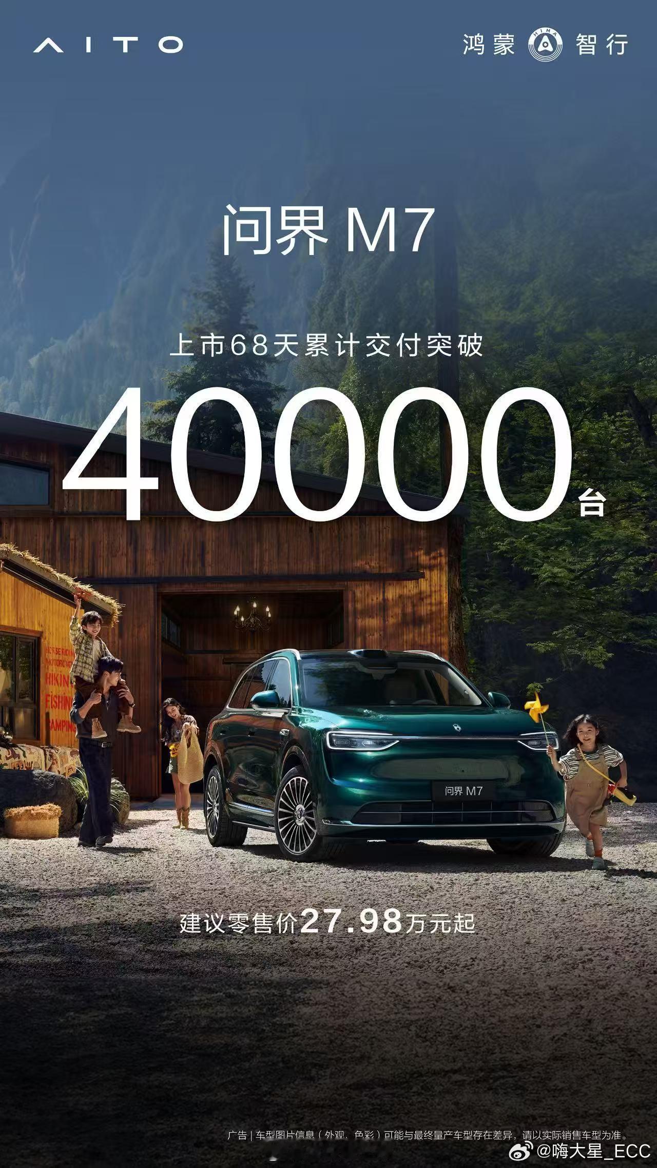 问界 M7 交付量突破4万台:36天 2w57天 3w(间隔21天)68天 4w(间隔11天)产能又提速了