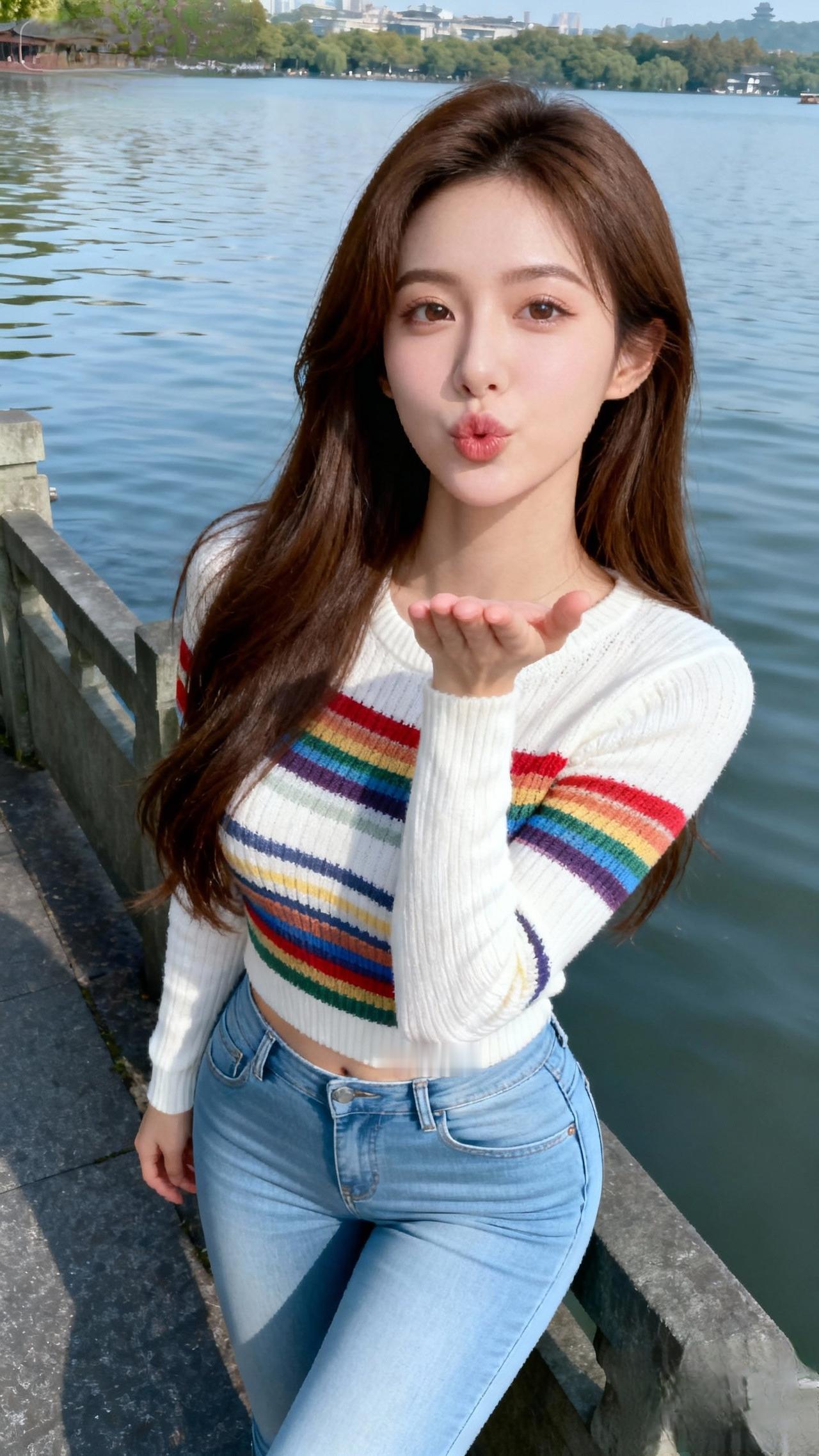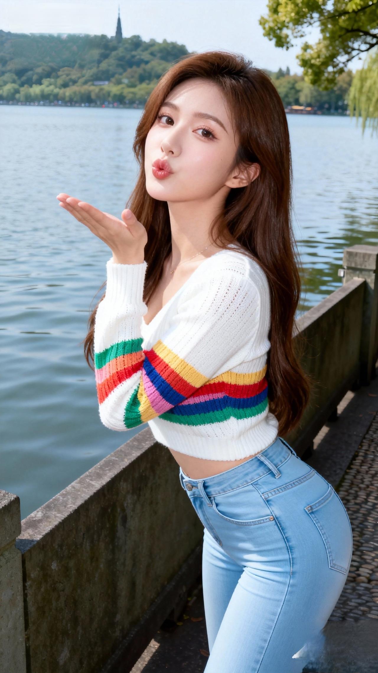 湖边少女,彩虹毛衣,甜美微笑,阳光明媚,心情大好!🌞💕