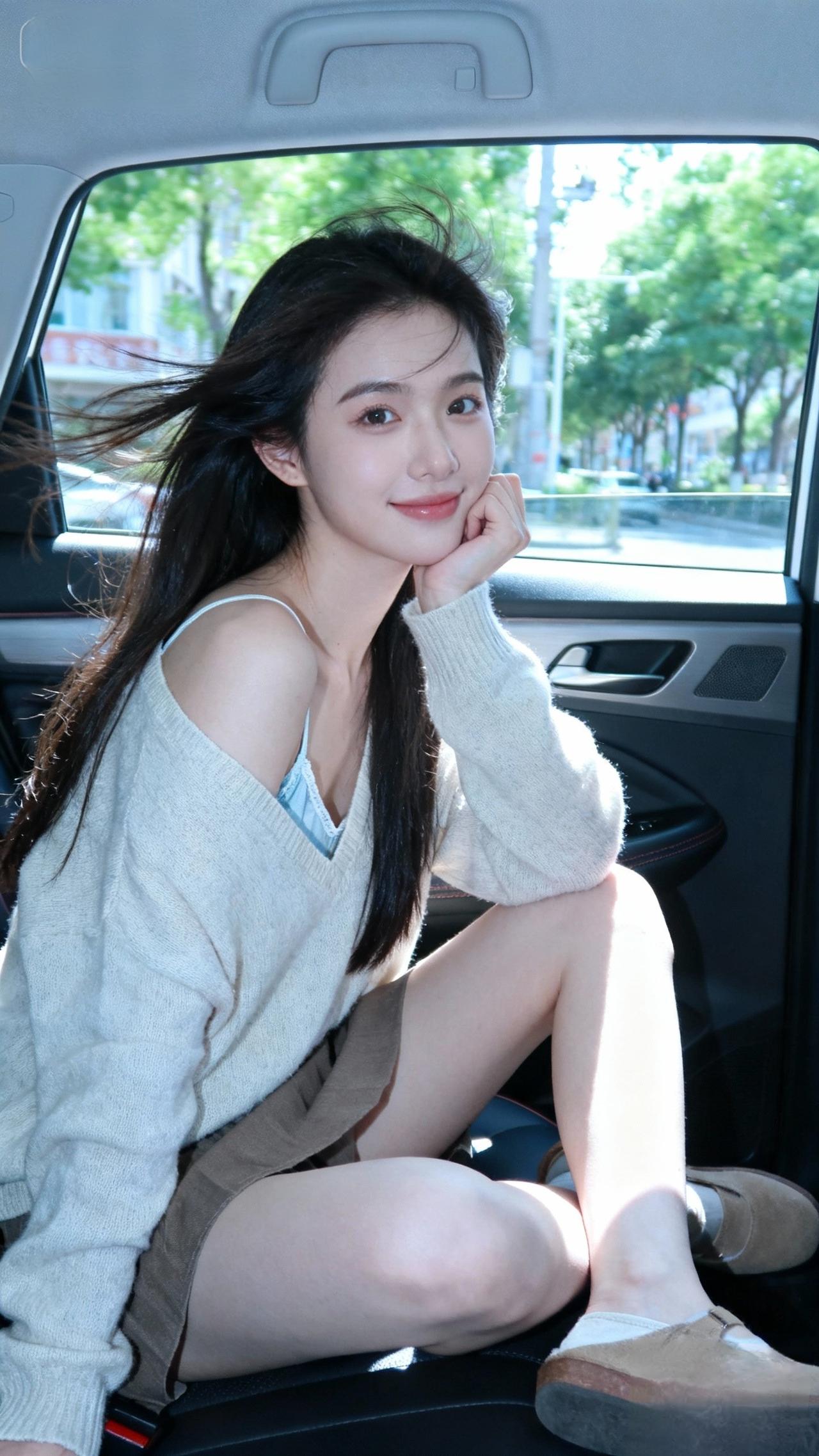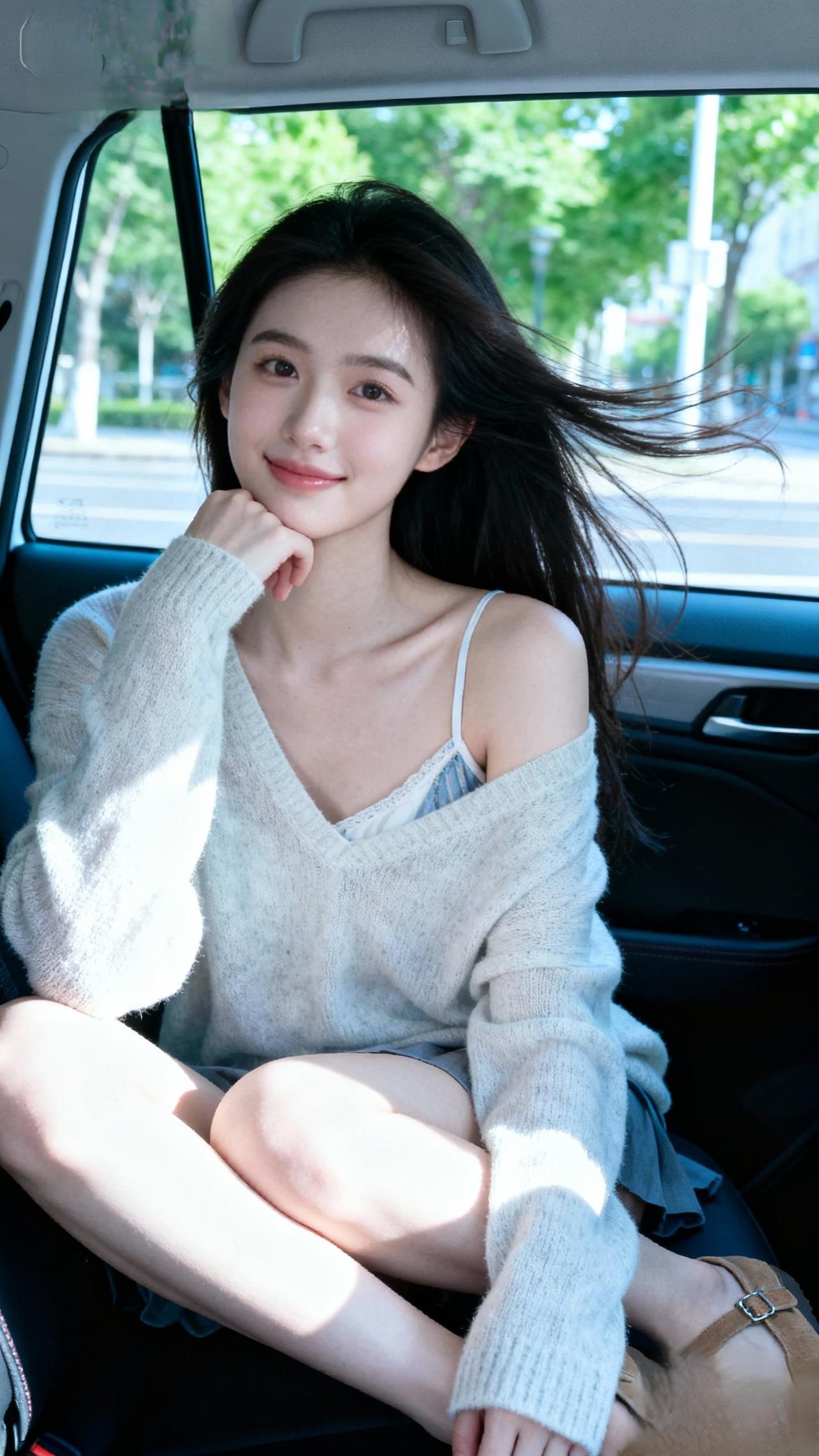 阳光洒进车窗,少女甜美微笑,车内舒适时光。🌞💕🚗