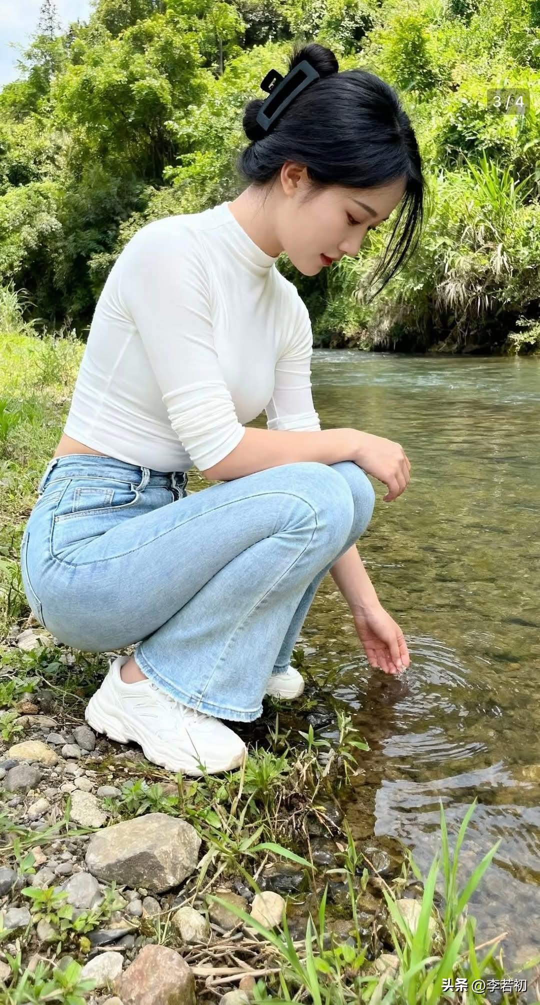 溪石蹭着喇叭裤的边,风把蒲苇絮揉进白衫的软。蹲在河床的潮气里,连呼吸都裹着草木的淡——这刻的松弛,是山野递来的见面礼。