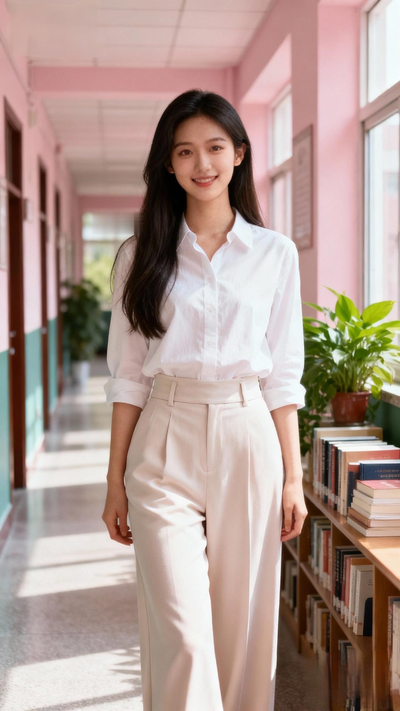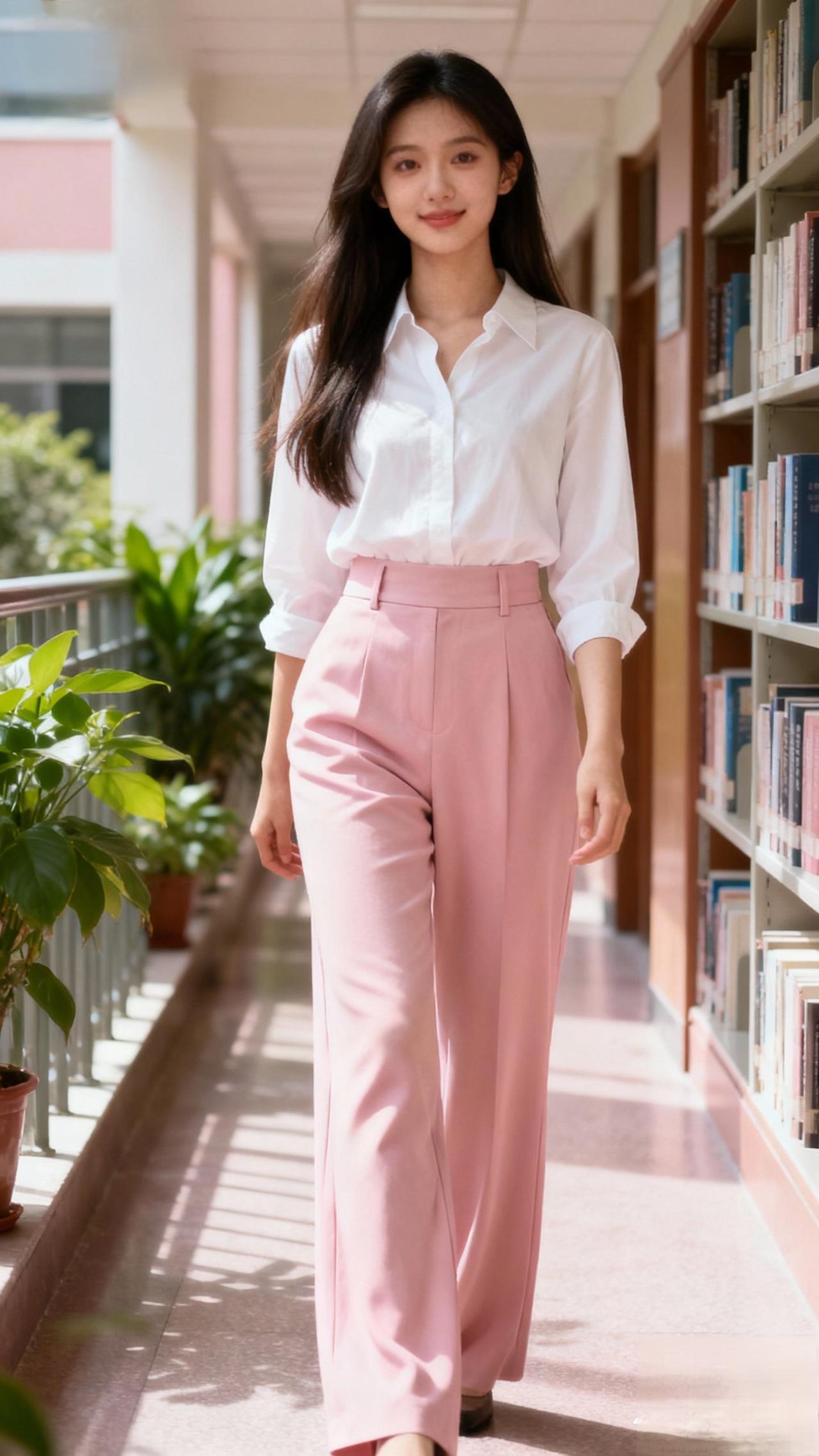图书馆里的温柔时光,白衬衫与粉裤子的完美搭配,书香与自然相伴。