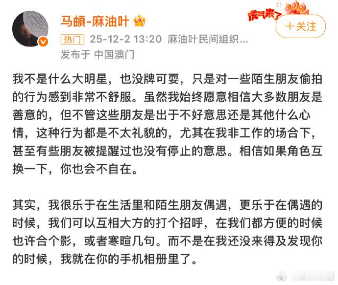 马頔发文回应被偶遇偷拍一事今天下午马頔发文回应被偶遇偷拍一事,表示自己并非大明星,也无架子可摆,但对陌生人在非工作场合偷拍的行为感到非常不舒服。希望双方大方打招呼!互相尊重!