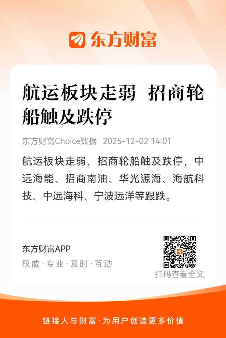 东方财富股票【航运板块走弱 招商轮船触及跌停】航运板块走弱,招商轮船触及跌停,中远海能、招商南油、华光源海、海航科技、中远海科、宁波远洋等跟跌。航运板块走弱 招商轮船触及跌停 (来自