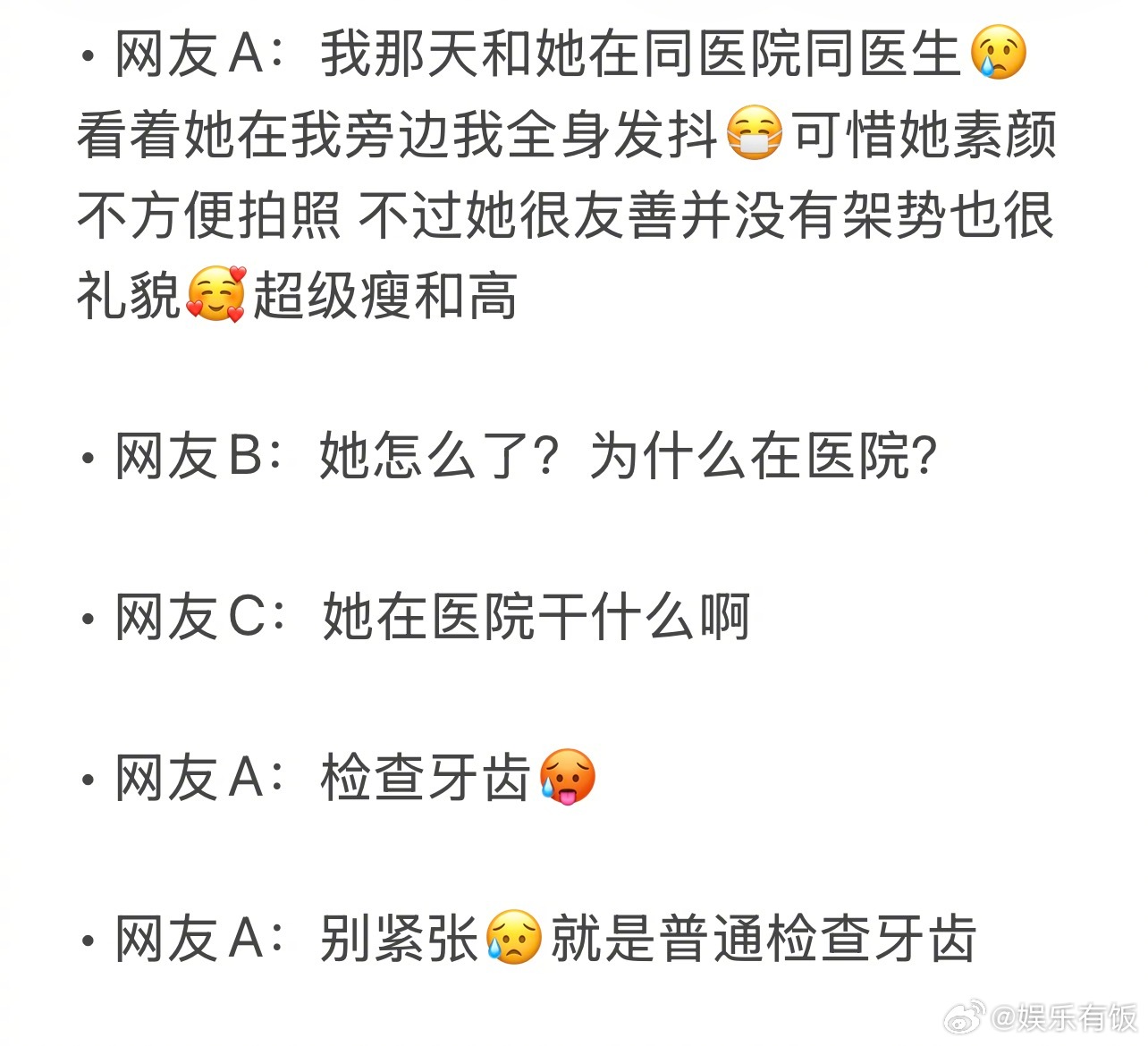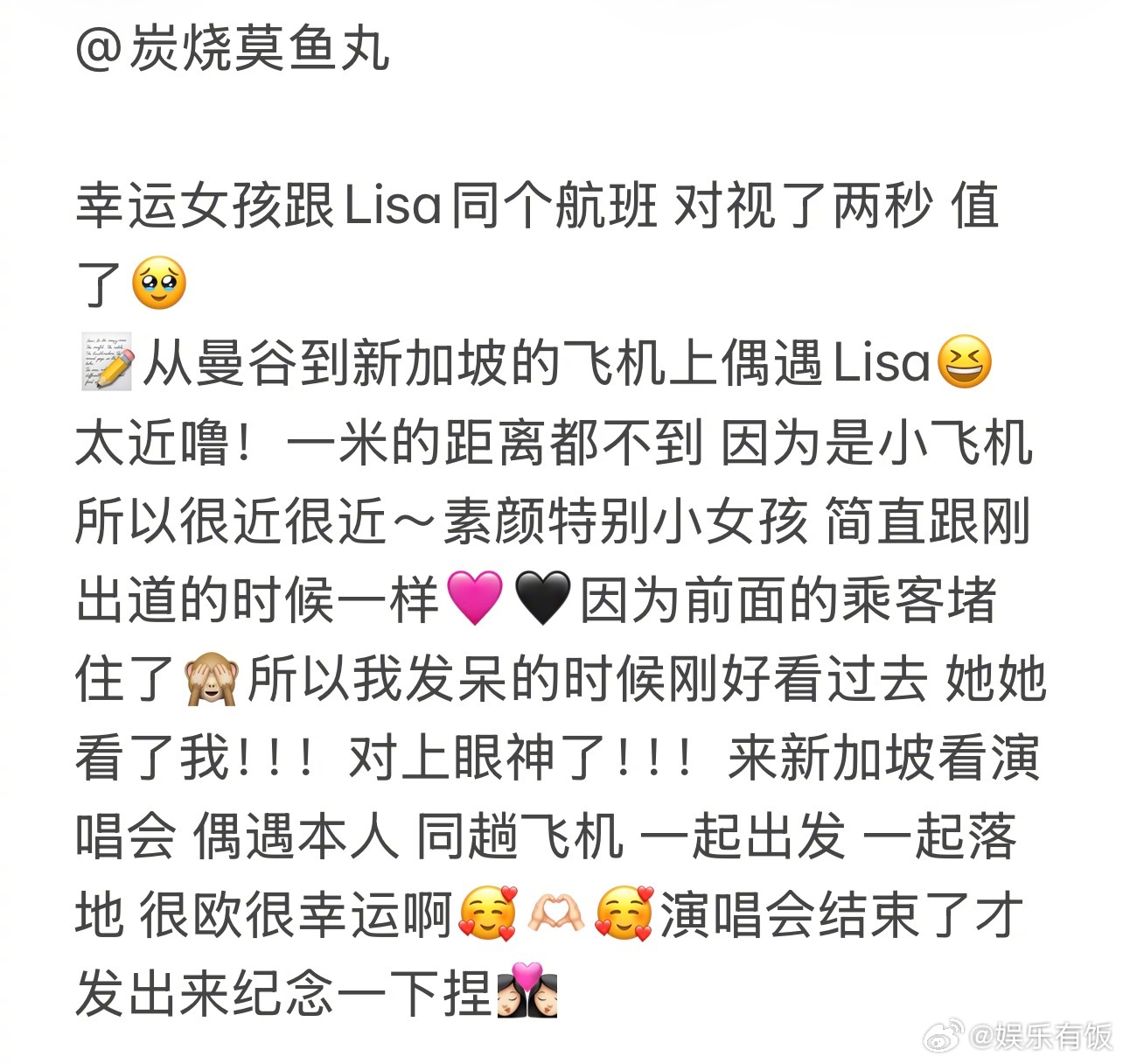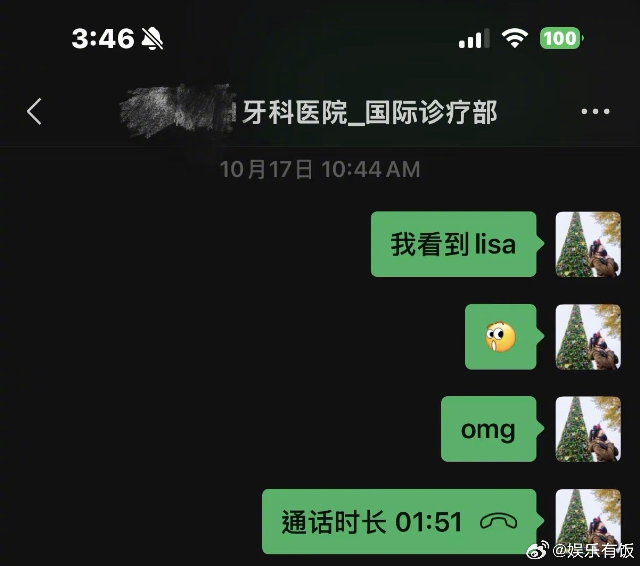 和Lisa一起出发一起落地偶遇Lisa检查牙齿 近日,多位网友在社交平台分享偶遇艺人Lisa的经历:有网友透露,自己10月份在医院与Lisa同诊,对方因检查牙齿就诊,素颜现身的她“友善没架子、又瘦又高”,让这位网友紧张到“全身发抖”;另有网友则分享了在曼谷飞新加坡的航班上偶遇Lisa的经历,称两人距离不足一米,对方素颜状态“像刚出道的小女孩”,还意外对视两秒,该网友直言“来新加坡看演唱会偶遇本人,同出发同落地,太幸运”。