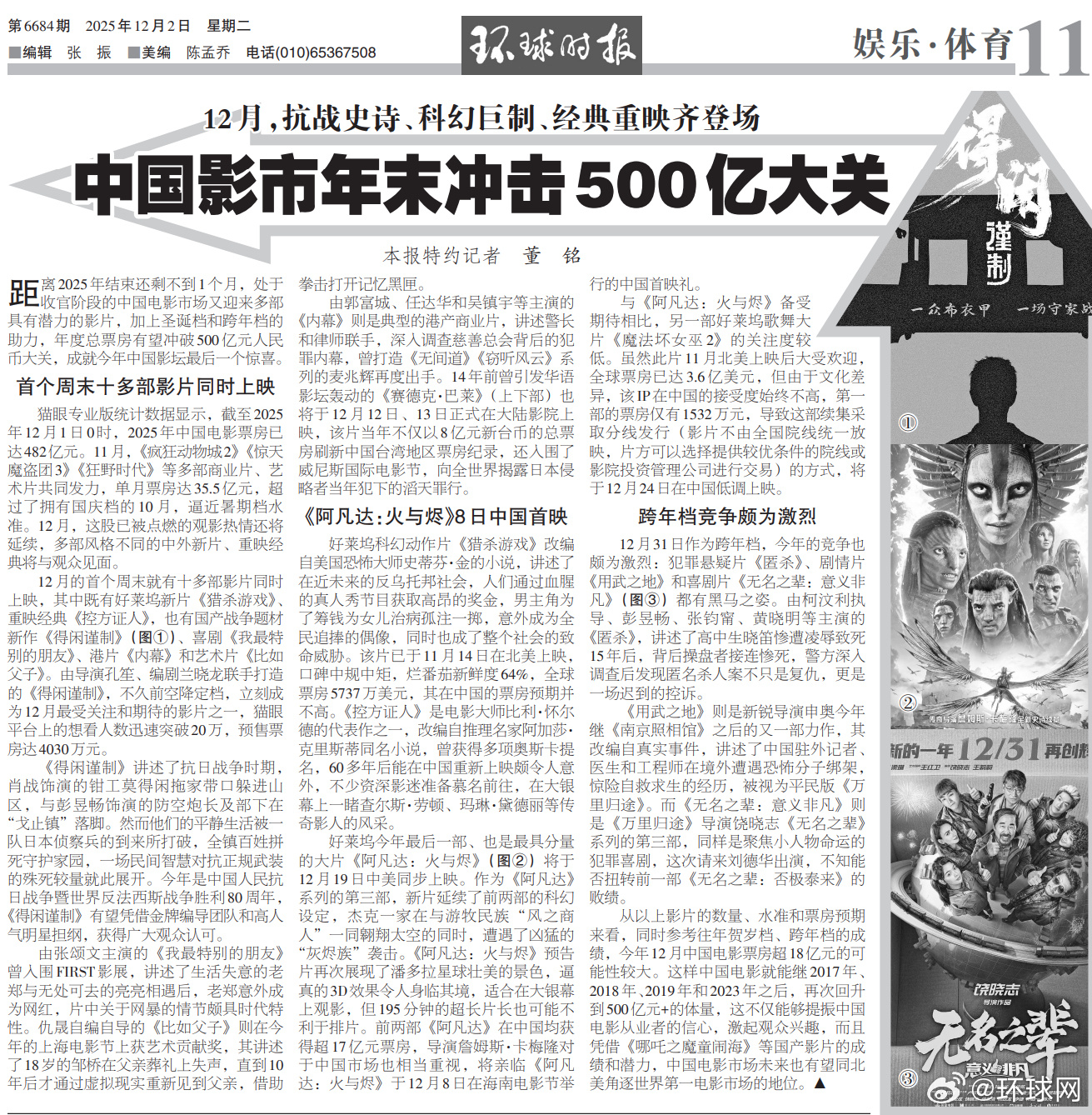 #年末你最想看哪部电影#【#中国影市年末冲击500亿大关#】距离2025年结束还剩不到1个月,处于收官阶段的中国电影市场又迎来多部具有潜力的影片,加上圣诞档和跨年档的助力,年度总票房有望冲破500亿元人民币大关,成就今年中国影坛最后一个惊喜。首个周末十多部影片同时上映猫眼专业版统计数据显示,截至2025年12月1日0时,2025年中国电影票房已达482亿元。11月,《疯狂动物城2》《惊天魔盗团3》《狂野时代》等多部商业片、艺术片共同发力,单月票房达35.5亿元,超过了拥有国庆档的10月,逼近暑期档水准。12月,这股已被点燃的观影热情还将延续,多部风格不同的中外新片、重映经典将与观众见面。12月的首个周末就有十多部影片同时上映,其中既有好莱坞新片《猎杀游戏》、重映经典《控方证人》,也有国产战争题材新作《得闲谨制》、喜剧《我最特别的朋友》、港片《内幕》和艺术片《比如父子》。由导演孔笙、编剧兰晓龙联手打造的《得闲谨制》,不久前空降定档,立刻成为12月最受关注和期待的影片之一,猫眼平台上的想看人数迅速突破20万,预售票房达4030万元。《得闲谨制》讲述了抗日战争时期,饰演的钳工莫得闲拖家带口躲进山区,与饰演的防空炮长及部下在“戈止镇”落脚。然而他们的平静生活被一队日本侦察兵的到来所打破,全镇百姓拼死守护家园,一场民间智慧对抗正规武装的殊死较量就此展开。今年是中国人民抗日战争暨世界反法西斯战争胜利80周年,《得闲谨制》有望凭借金牌编导团队和高人气明星担纲,获得广大观众认可。由主演的《我最特别的朋友》曾入围FIRST影展,讲述了生活失意的老郑与无处可去的亮亮相遇后,老郑意外成为网红,片中关于网暴的情节颇具时代特性。仇晟自编自导的《比如父子》则在今年的上海电影节上获艺术贡献奖,其讲述了18岁的邹桥在父亲葬礼上失声,直到10年后才通过虚拟现实重新见到父亲,借助拳击打开记忆黑匣。由、任达华和吴镇宇等主演的《内幕》则是典型的港产商业片,讲述警长和律师联手,深入调查慈善总会背后的犯罪内幕,曾打造《无间道》《窃听风云》系列的再度出手。14年前曾引发华语影坛轰动的《赛德克·巴莱》(上下部)也将于12月12日、13日正式在大陆影院上映,该片当年不仅以8亿元新台币的总票房刷新中国台湾地区票房纪录,还入围了威尼斯国际电影节,向全世界揭露日本侵略者当年犯下的滔天罪行。《阿凡达:火与烬》8日中国首映好莱坞科幻动作片《猎杀游戏》改编自美国恐怖大师史蒂芬·金的小说,讲述了在近未来的反乌托邦社会,人们通过血腥的真人秀节目获取高昂的奖金,男主角为了筹钱为女儿治病孤注一掷,意外成为全民追捧的偶像,同时也成了整个社会的致命威胁。该片已于11月14日在北美上映,口碑中规中矩,烂番茄新鲜度64%,全球票房5737万美元,其在中国的票房预期并不高。《控方证人》是电影大师比利·怀尔德的代表作之一,改编自推理名家阿加莎·克里斯蒂同名小说,曾获得多项奥斯卡提名,60多年后能在中国重新上映颇令人意外,不少资深影迷准备慕名前往,在大银幕上一睹查尔斯·劳顿、玛琳·黛德丽等传奇影人的风采。好莱坞今年最后一部、也是最具分量的大片《阿凡达:火与烬》将于12月19日中美同步上映。作为《阿凡达》系列的第三部,新片延续了前两部的科幻设定,杰克一家在与游牧民族“风之商人”一同翱翔太空的同时,遭遇了凶猛的“灰烬族”袭击。《阿凡达:火与烬》预告片再次展现了潘多拉星球壮美的景色,逼真的3D效果令人身临其境,适合在大银幕上观影,但195分钟的超长片长也可能不利于排片。前两部《阿凡达》在中国均获得超17亿元票房,导演詹姆斯·卡梅隆对于中国市场也相当重视,将亲临《阿凡达:火与烬》于12月8日在海南电影节举行的中国首映礼。与《阿凡达:火与烬》备受期待相比,另一部好莱坞歌舞大片《魔法坏女巫2》的关注度较低。虽然此片11月北美上映后大受欢迎,全球票房已达3.6亿美元,但由于文化差异,该IP在中国的接受度始终不高,第一部的票房仅有1532万元,导致这部续集采取分线发行(影片不由全国院线统一放映,片方可以选择提供较优条件的院线或影院投资管理公司进行交易)的方式,将于12月24日在中国低调上映。跨年档竞争颇为激烈12月31日作为跨年档,今年的竞争也颇为激烈:犯罪悬疑片《匿杀》、剧情片《用武之地》和喜剧片《无名之辈:意义非凡》都有黑马之姿。由柯汶利执导、彭昱畅、、等主演的《匿杀》,讲述了高中生晓笛惨遭凌辱致死15年后,背后操盘者接连惨死,警方深入调查后发现匿名杀人案不只是复仇,更是一场迟到的控诉。《用武之地》则是新锐导演申奥今年继《南京照相馆》之后的又一部力作,其改编自真实事件,讲述了中国驻外记者、医生和工程师在境外遭遇恐怖分子绑架,惊险自救求生的经历,被视为平民版《万里归途》。而《无名之辈:意义非凡》则是《万里归途》导演饶晓志《无名之辈》系列的第三部,同样是聚焦小人物命运的犯罪喜剧,这次请来刘德华出演,不知能否扭转前一部《无名之辈:否极泰来》的败绩。从以上影片的数量、水准和票房预期来看,同时参考往年贺岁档、跨年档的成绩,今年12月中国电影票房超18亿元的可能性较大。这样中国电影就能继2017年、2018年、2019年和2023年之后,再次回