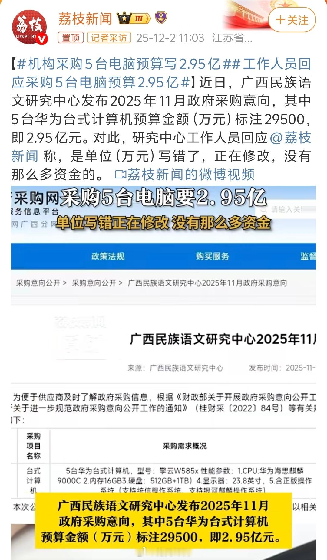 机构采购5台电脑预算写2.95亿5台电脑2.95亿,天价采购阿!原来是单位写错了,2.95万差不多