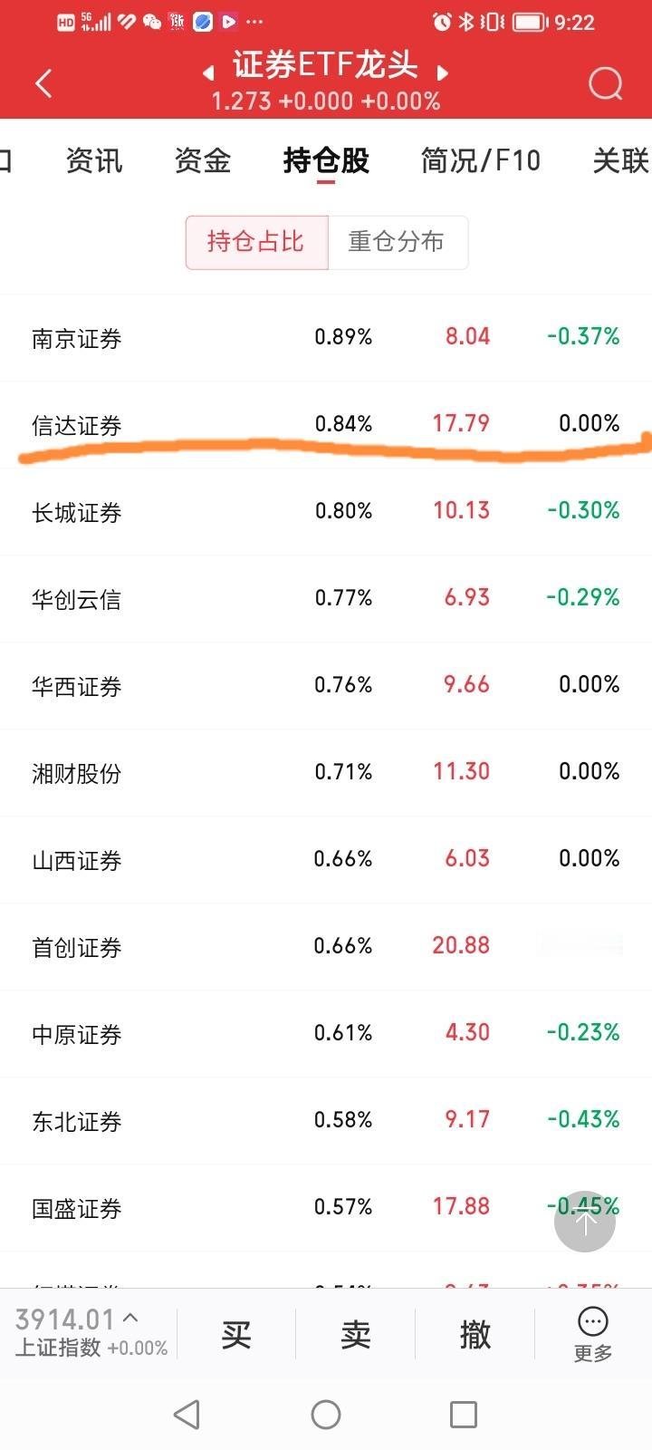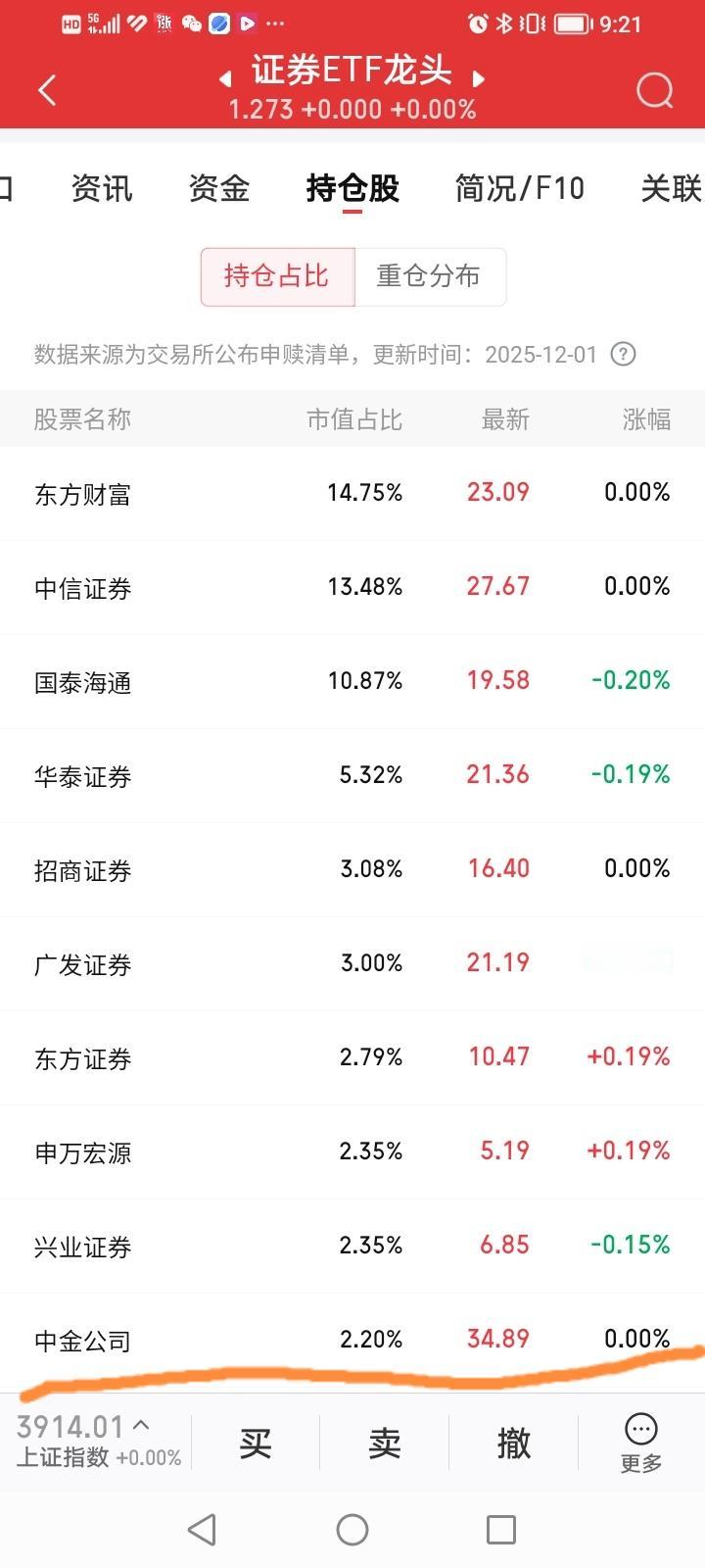 券商ETF龙头(560090)能建仓了吗?明天准备逢低分批进点券商ETF龙头了。理由如下: 1、券商ETF龙头第一大重仓股东方财富因高管减持套现,股价连续两天大跌,导致券商ETF龙头也跌了不少,似乎该歇口气了。 2、今天人民币大幅升值,已经升破7.07,利好券商股。 3、券商ETF龙头配置持有中金公司、东兴证券、信达证券等三合一购并重组券商股,买入券商ETF龙头相当于间接买入了一定比例的中金、东兴、信达股票。 4、ETF基金没有印花税,交易佣金较低,一旦买错了,跑起来快,成本低。