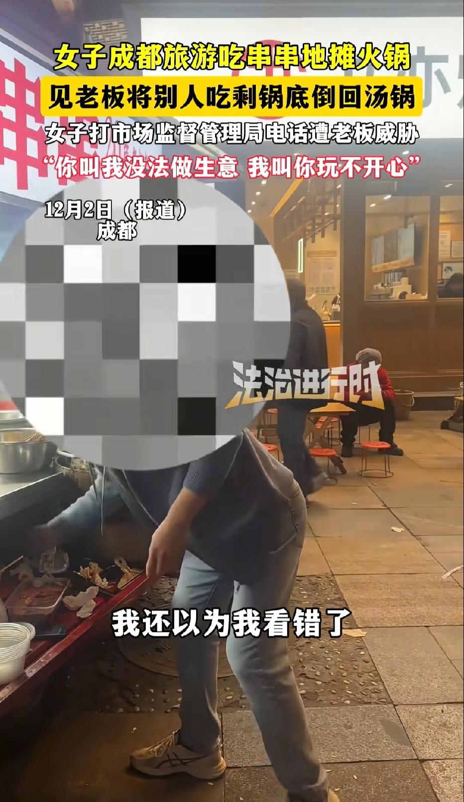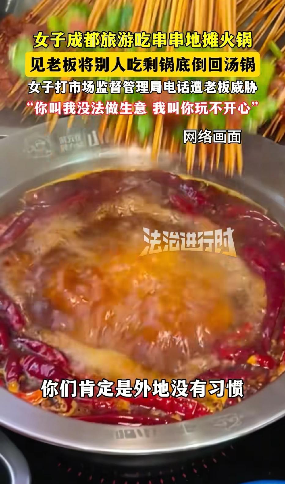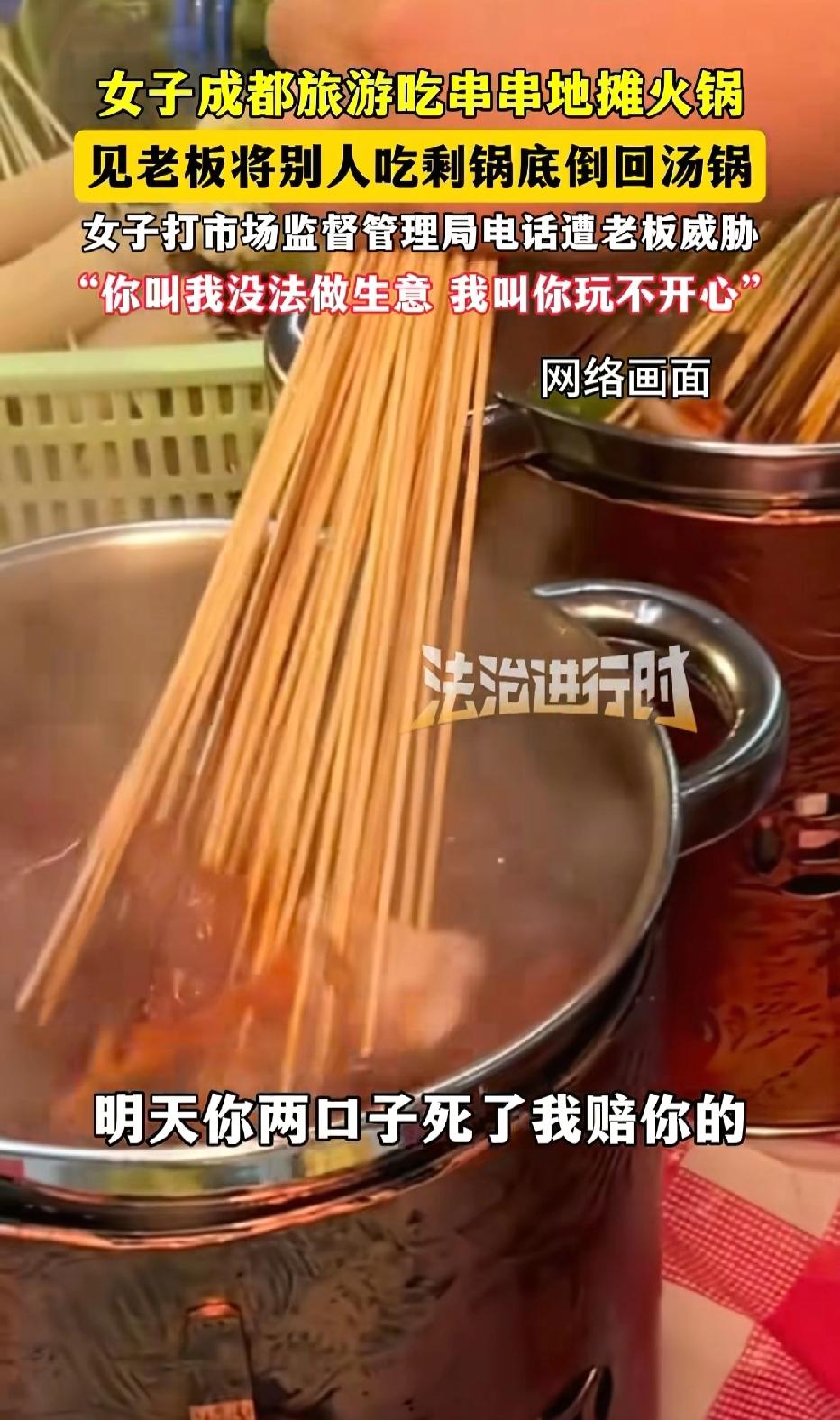 四川成都,女子去吃串串地摊火锅,发现老板将别人吃剩的锅底,倒回共用汤锅二次利用,女子当场质疑不卫生,不料,老板却觉得没什么,还称都这样干了二三十年。女子不放心,直言不想得病,而老板接下来的话让人直呼受不了。 据悉,一女子和男友一起去某地旅游,晚上他们路过一家串串地摊火锅。 火锅摊老板看到客人光顾,赶紧打招呼:本地老味道,放心吃。 色香味俱全的火锅瞬间让他们走不动了,两人决定就在路边摊品尝一下。 谁知,就在她们吃得不亦乐乎的过程中,女子竟然发现了不堪的一幕。 只见邻桌客人刚起身离开,老板竟端起他们吃剩的锅底,当着女子的面,径直倒进了旁边那口盛满滚烫红油的共用汤锅! 浑浊的汤底里还浮着几根没吃完的青菜,与新汤混合时泛起一层诡异的泡沫。 原来,老板是二次利用锅底,让别人重复吃。 而老板脸上毫无愧色,仿佛只是完成了一件再平常不过的事。 女子当场看傻了眼,她还以为自己看错了。可是事实就摆在她眼前。 她赶紧拽了拽男友的手臂,把看到的一幕说了出来。 男友顺着女子的视线看去,脸色瞬间沉了下来。 作为吃货,他们能接受路边摊的简陋,但绝不能容忍这般操作,那些吃剩的汤底里,藏着多少人的唾液、细菌?病从口入的道理,难道老板不懂? 眼看都没有人管,女子秉着食品安全卫生的原则,她直接上前质问老板。 谁知,老板不仅没有知错就改,反而还振振有词:我都干了二三十年了,一直都是这样!你们肯定是外地的,没有习惯。 女子当场反驳,我们不想得病,我们为什么要吃剩下的。 这话说得没毛病,病从口入,饮食那肯定是要注意的。 老板一听,火气也上来了,他怼了一句:我这里有电话,明天你们两口子出事了,我赔你。 女子越听老板越说不像话,他们不在乎钱,只在乎食品卫生安全,为什么老板做了亏心事,还如此不讲理,她还想说些什么。 但老板比她更理直气壮,一再表示当地的串串都是这样。 他甚至还放话威胁,假如你今天让我做不成生意,我就叫你们两个耍不开心! 女子和男友也被气得不行,们提出质疑不是正常吗,老板这样做分明是不对,可是他如此颠倒是非。 二十年的陋习,难道就成了合理的借口? 那些被蒙在鼓里的食客,或许有人因此生病,却从未想过问题出在这一锅"循环利用"的汤底里。 那些沉默的人,或许是出于无奈,或许是习以为常,但正是这种沉默,让陋习得以延续。 女子觉得老板肯定是忽悠人,这真的是当地的习惯吗? 不应该重复利用火锅底料和不应回收菜品再使用,这本是大家零容忍吧! 面对老板的威胁,女子没有退缩,始终坚持自己的立场。 《食品安全法》第34条规定:禁止生产经营用回收食品作为原料生产的食品。 老板将食客吃剩的锅底倒回共用汤锅,本质就是把含有唾液、食物残渣的回收食品当作原料复用,完全触碰了这条法律红线,属于典型的违法经营行为。 针对上述违法情形,执法部门可没收老板的违法所得、用于违法经营的工具和原料,还可处以罚款。 即便老板声称“干了二三十年”,反而证明其长期故意违法,属于“情节严重”的加重处罚情形,可依法吊销许可证并拘留。 面对不良商家的蛮不讲理,妥协只会纵容违法,唯有坚守原则、勇敢维权,才能让法律发挥作用,让失信者付出代价。 往往,我们的生活正需要像女子这样的“小人物”挺身而出、勇敢发声,才能汇聚成倒逼商家规范经营、推动监管部门介入的强大力量。 让餐饮行业的底线不被利益践踏,让每个人都能吃得安心、吃得放心。 对此,你怎么看?