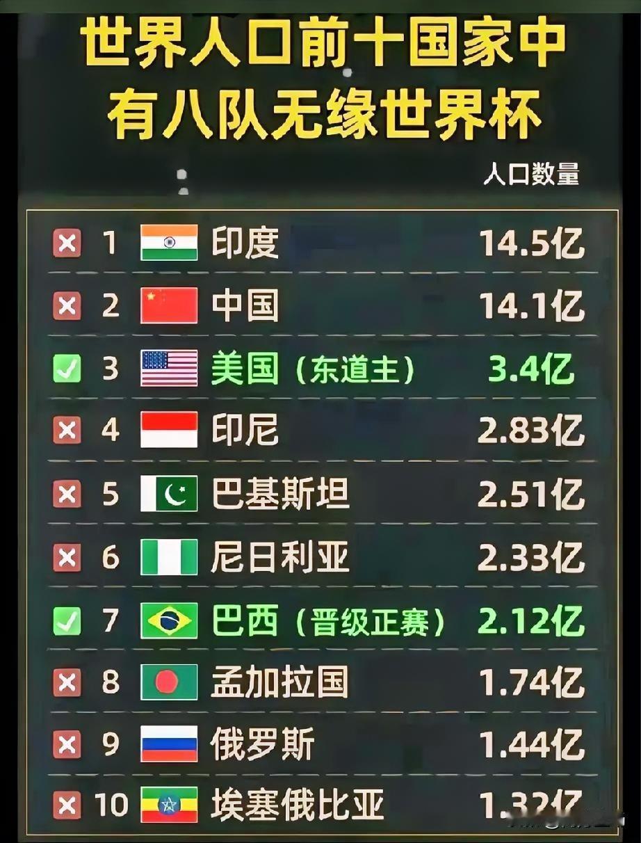 这很尴尬啊!世界人口前十的国家,竟然有8个无缘2026年美加墨世界杯! 印度、中国、印尼、巴基斯坦、尼日利亚、孟加拉国、俄罗斯、埃塞俄比亚…这些人口大国集体缺席。算下来,这8个国家总人口超过38亿!唯一靠实力打进去的,只有“足球王国”巴西。美国能参加,还是因为它是东道主。 人口多≠足球强啊!隔壁人口不到16万的小国库拉索都历史性晋级了。这说明足球发展真得靠青训、联赛和足球文化这些扎实的功夫。 世界杯扩军到48支队伍,给了更多小国梦想成真的机会,这更让我们反思:咱们的足球,路到底该怎么走? (图片来源于网络) 美加墨世界杯世界杯 生活中那些突来的感悟 分享你的今日随笔人口排名 全球人口对比