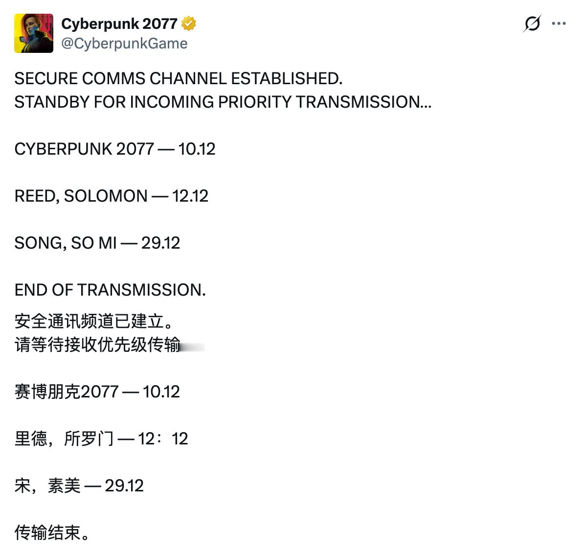 【《赛博朋克2077》发售纪念推文引猜测,5周年大的来了?】《赛博朋克2077》发布了12月的生日&纪念日历,游戏将于12月10日迎来发售5周年:“安全通信频道已建立。待接收优先传输信息……”,另外,游戏内角色所罗门·李德和宋昭美分别于12月的12日及29日迎来生日。外媒insider-gaming猜测纪念日当天可能会公布有关2.4版本更新的消息,或引入全新功能和游戏内容等。但目前处于猜测阶段,帖子中也没有透露更多细节,一切有待官方公布。赛博朋克2077