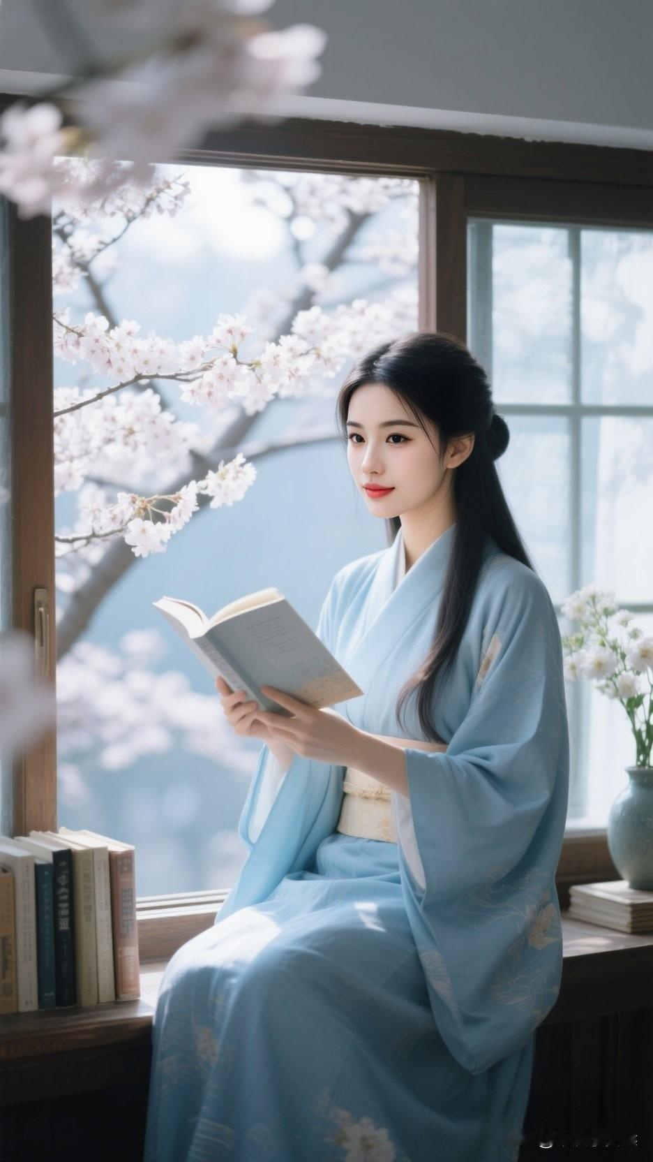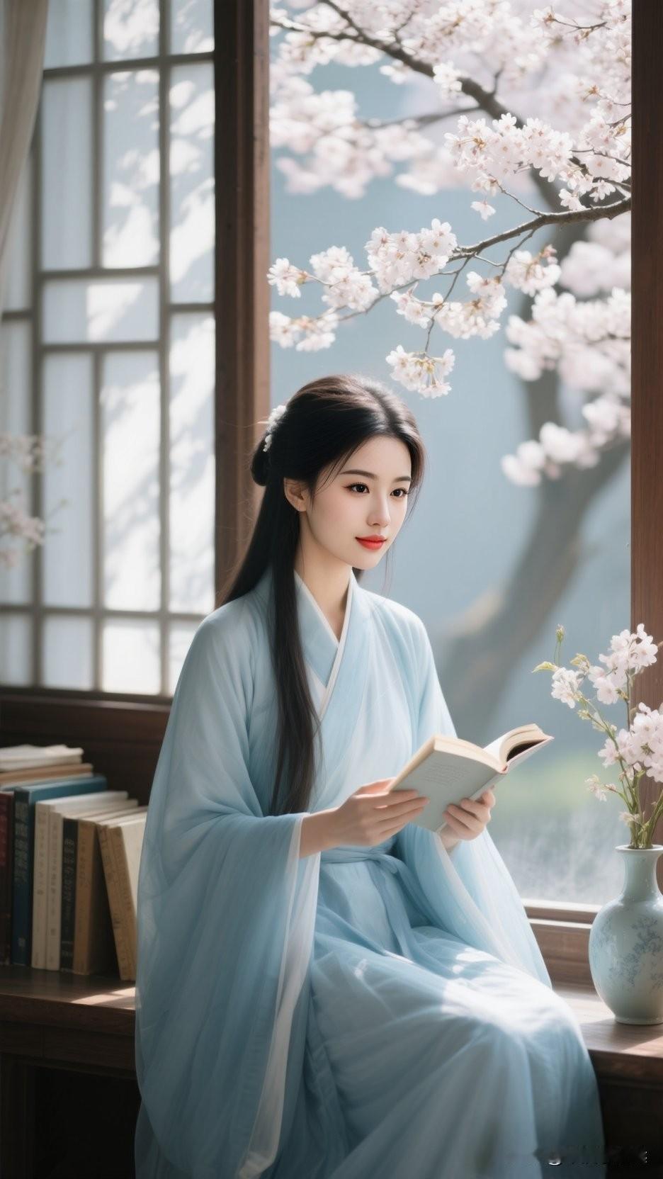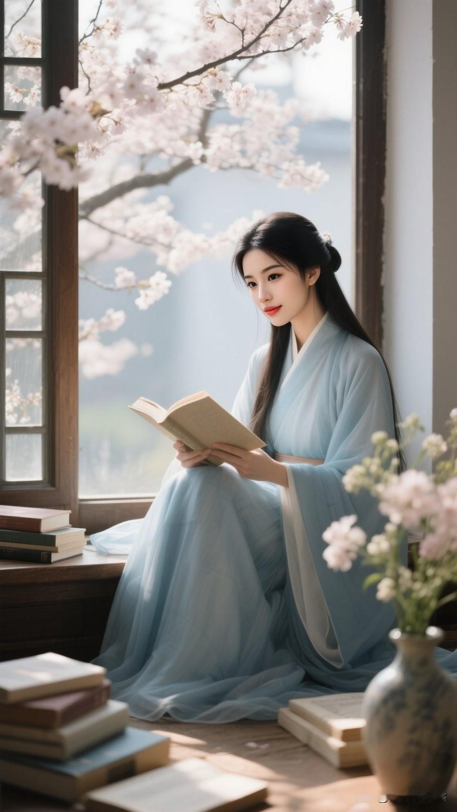 静坐窗边,轻翻书页,岁月静好。一袭得体的古风服饰,配上窗外的白色花瓣,尽显书香满满的氛围,一股岁月静好的气质铺面而来。