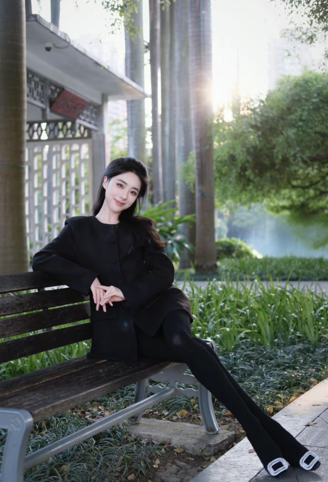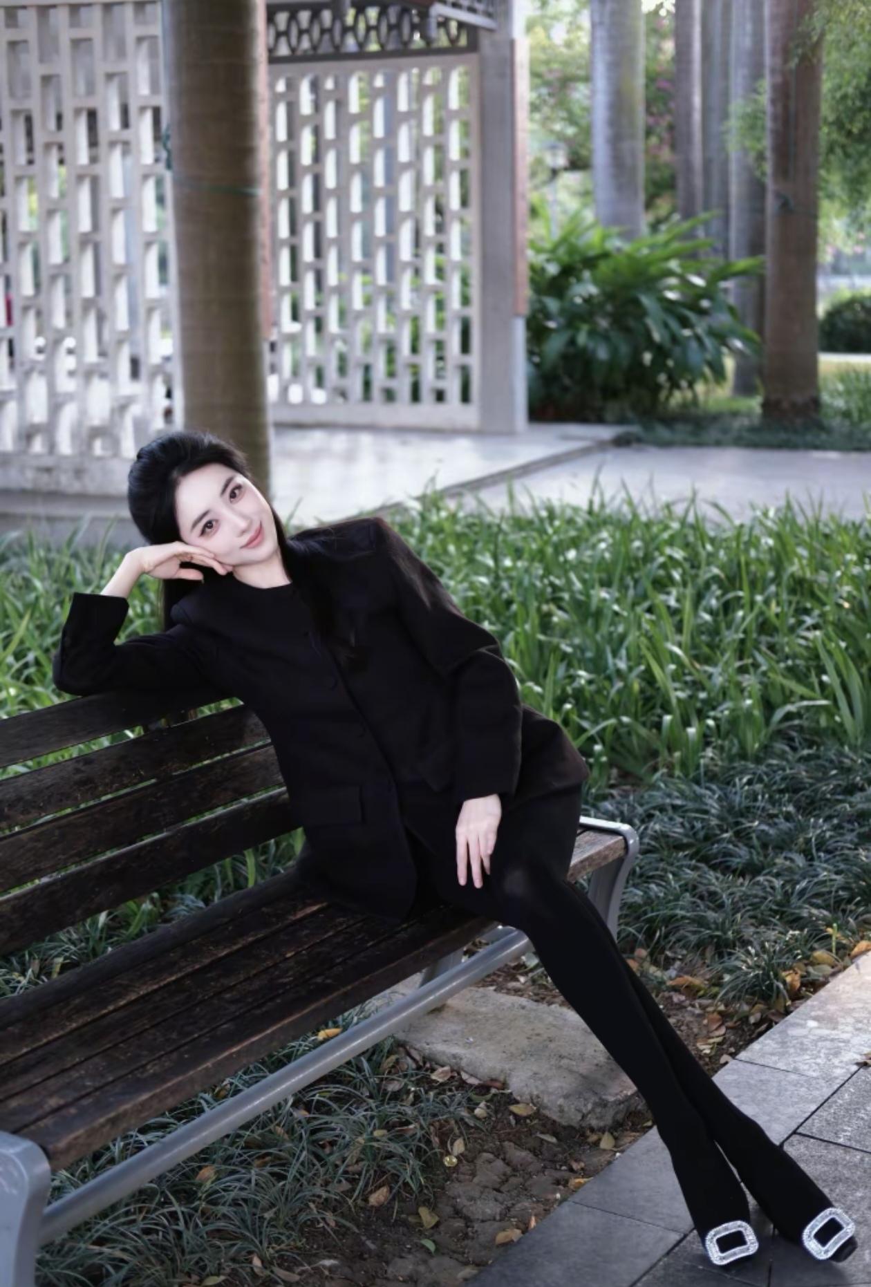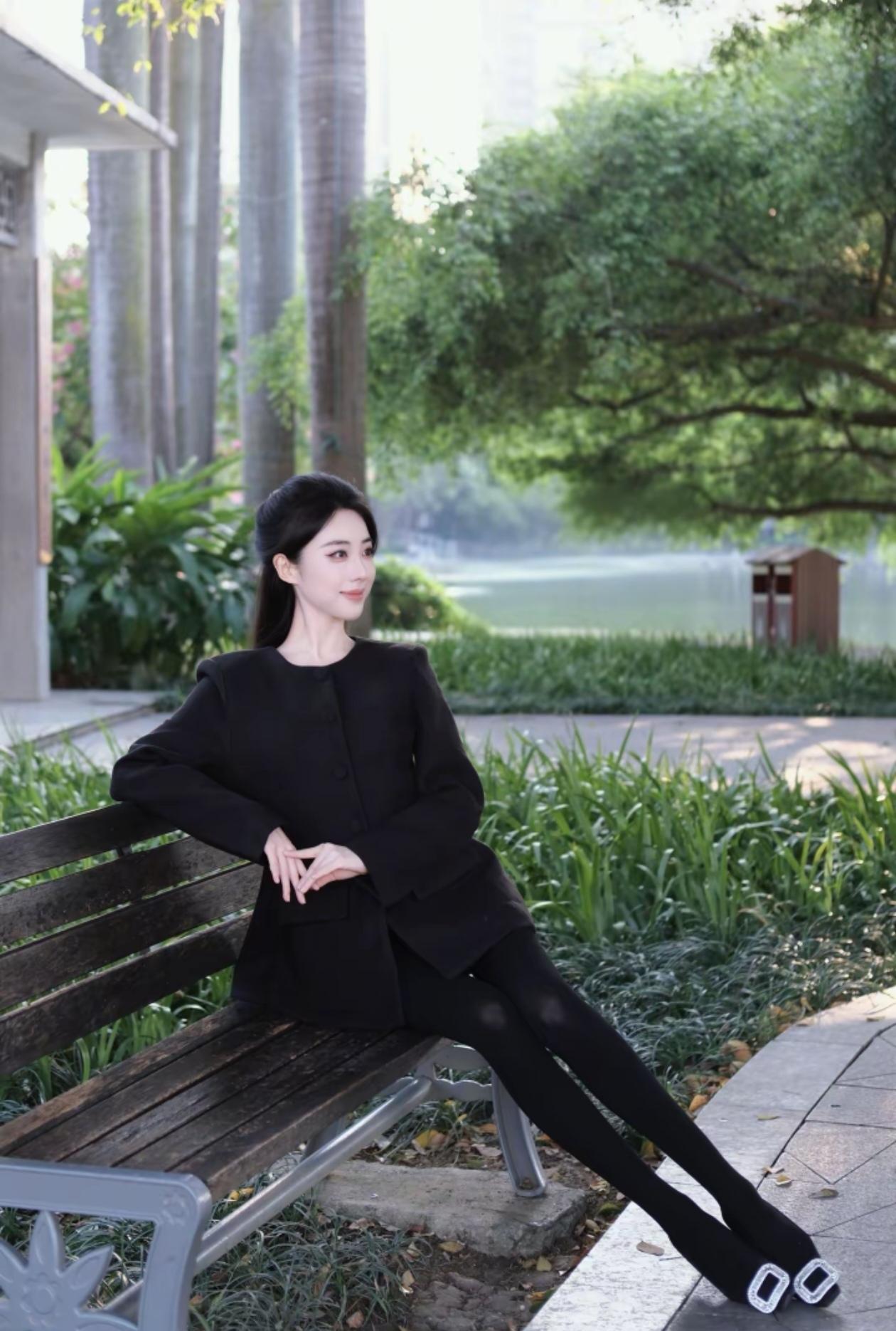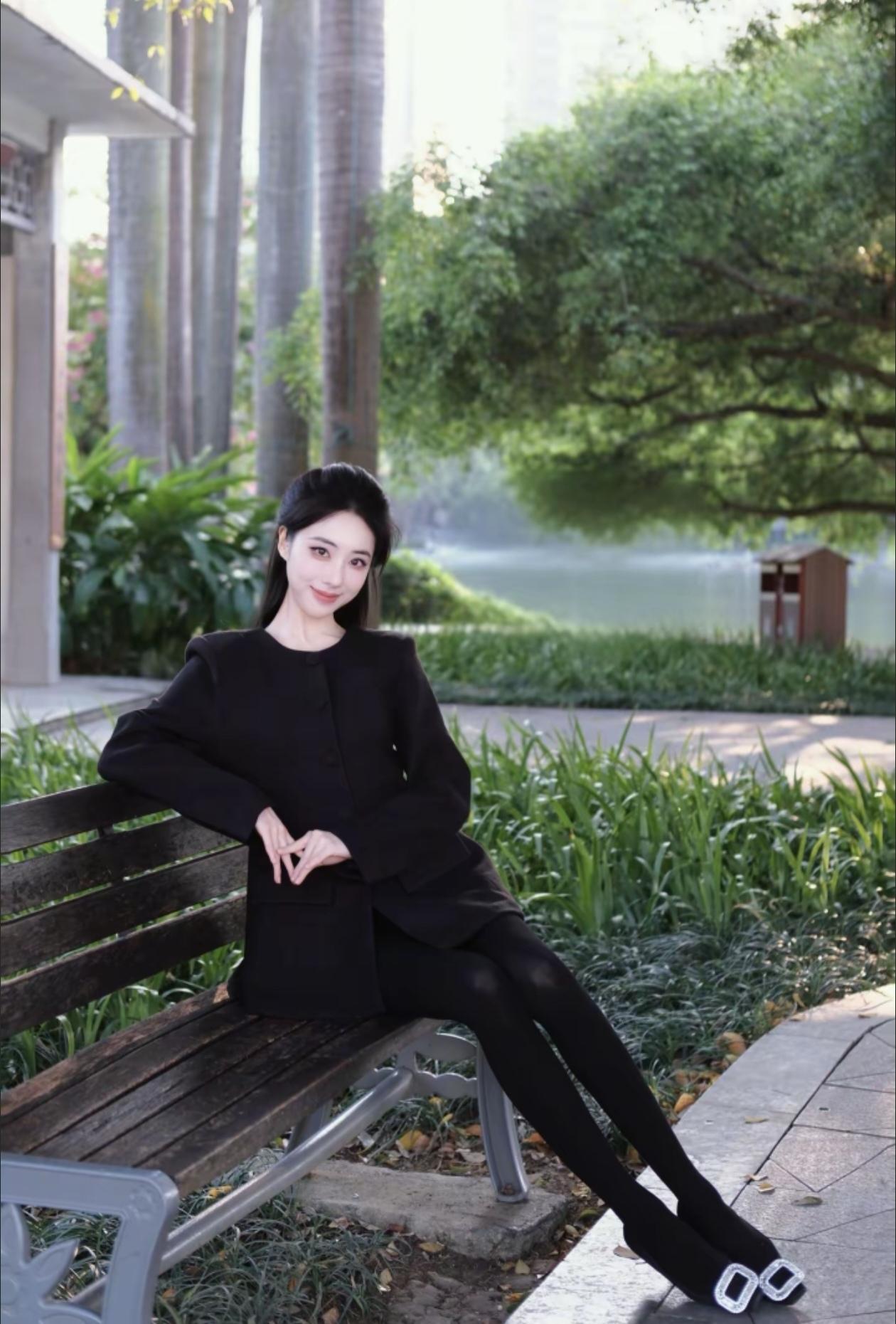 优雅黑衣,静坐长椅,享受宁静时光。