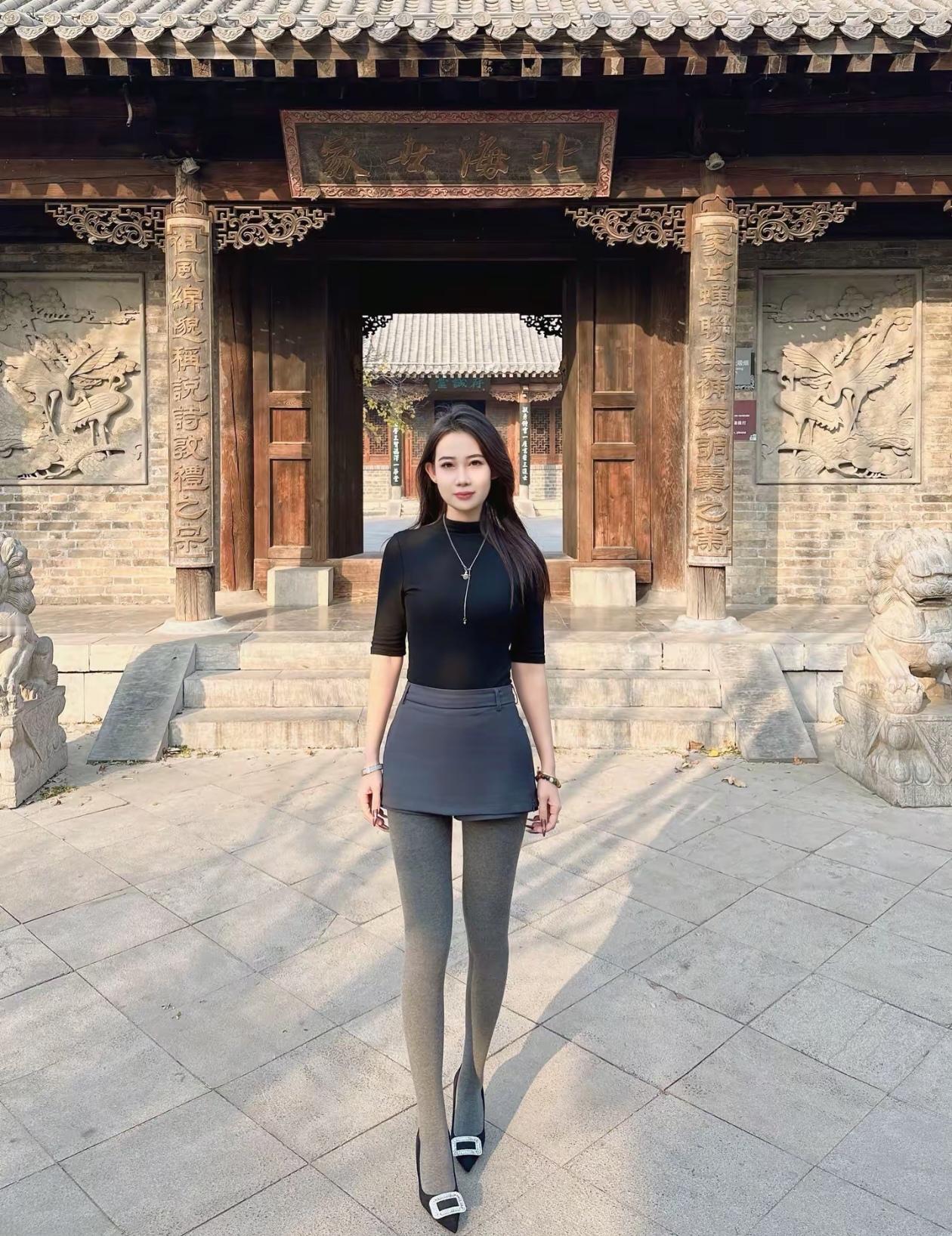 优雅黑衣女子漫步古风庭院,秋日暖阳洒落,岁月静好。