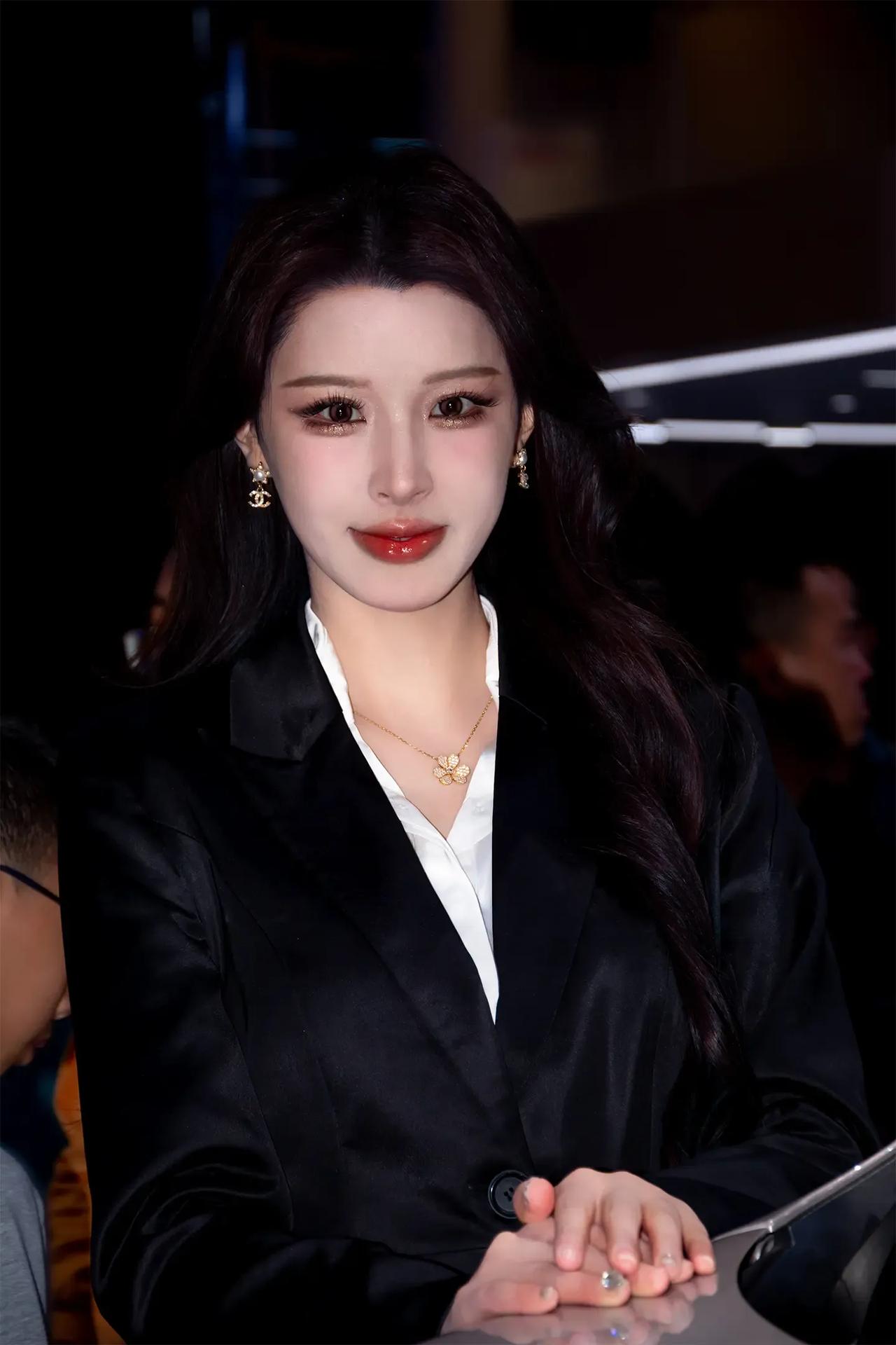 这姑娘穿着黑色西装,看着挺酷的。