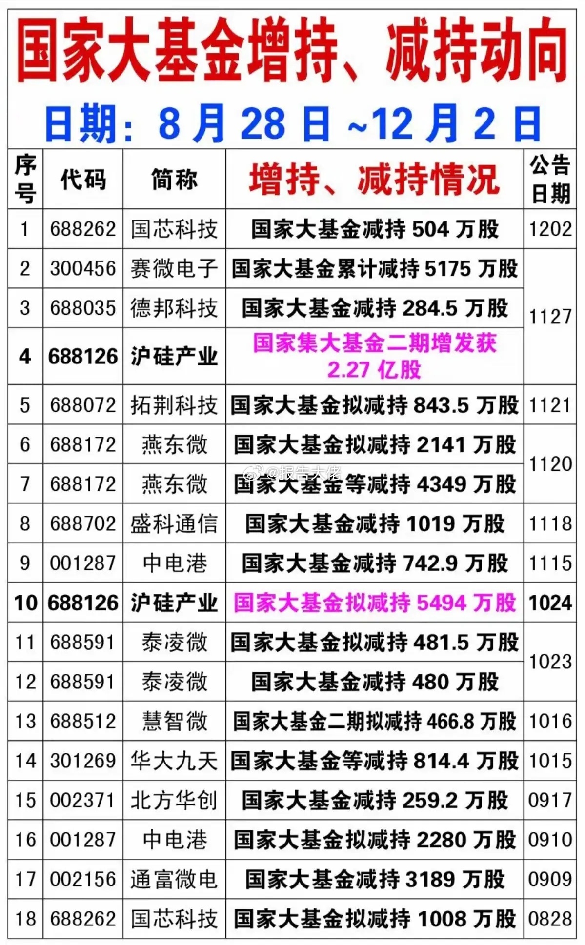 周二 国家大基金增持、减持动向!近期国家大基金持股包括计划减持情况汇总!高位股短期可以考虑回避。低位股可以跟踪观察!