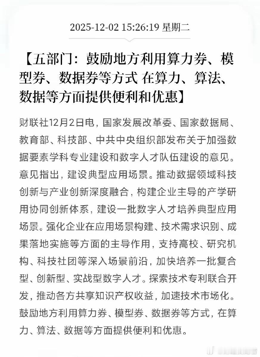 五部门联合放出“组合拳”!算力券、模型券、数据券要来了,数字中国建设按下加速键!这些公司将受益刚刚,国家发改委、国家数据局、教育部、科技部、中组部等,五部门联合发布重要意见,鼓励地方利用算力券、模型券、数据券等方式,为数字产业发展,提供实实在在的支持!这标志着从中央到地方,一套推动数据要素,和数字人才的系统性,支持政策将要落地了。政策亮点:1. 创新支持工具:首次提出“算力券、模型券、数据券”等,创新普惠工具,直接降低企业和科研机构,在核心生产要素上的成本。2. 突出企业主导:强调构建企业主导,产学研用协同发展的创新体系,让市场最前沿的需求,直接牵引技术研发和人才培养。3. 建设应用场景:计划建设一批,数字人才培养的典型应用场景,推动“实战型”人才快速成长,破解学用脱节等痛点问题。为什么说这是一套“组合拳”?1.解决产业痛点“算力贵、模型训练成本高、高质量数据难获取”,是当前AI与数字经济,发展过程中遇到的三大主要难题。此次政府层面牵头,以“券”的形式,进行针对性补贴,相当于为创新企业,直接降低了“燃油费”,能极大激发中小企业,和科研机构的创新活力。2.从“给政策”到“给工具”,支持方式改变相比于以往,宏观的指导性意见,“券”是一种市场化、可操作、能精准滴灌的支持工具。它意味着,支持方式从“原则性鼓励”,升级为“实质性采购”,政府通过购买服务,引导资源流向最需要、最有效率的地方。3.人才、数据、算力“三位一体”系统布局文件将数据要素,学科建设、数字人才培养和算力算法,支持同步推进。这就不是单点突破,而是一套完整的系统性工程,可以用它来快速培育数字产业,解决长期制约我国数字经济发展的根本性问题——人才和核心要素。产业链影响:这套政策组合拳,预计将对多个产业赛道,产生深远影响:算力基础设施:算力券的直接刺激,将提升对智算中心、云计算服务的需求,利好头部算力提供商:浪潮信息、中科曙光、工业富联、商汤科技和阿里巴巴等数据要素和AI模型:数据券和模型券,将加速数据资源的合规流通,和价值释放,同时降低AI模型开发门槛。深耕垂直行业的专业数据服务商、AI模型和应用公司有望迎来快速发展:海天瑞声、科大讯飞、云从科技数字教育和培训:对“复合型、实战型”数字人才的迫切需求,将为面向产业的高质量职业培训、在线教育平台,带来巨大市场空间。深耕智慧教育领域的公司,值得关注:科大讯飞企业数字化服务:政策推动下,各行各业数字化转型进程将加速,为企业提供数字化,解决方案的科技公司,将深度受益,如提供企业云管理服务的金蝶等。“算力券”如果全面推广,你认为最受益的会是哪个环节?是算力基建、模型公司还是应用开发?今日看盘上证指数a股
