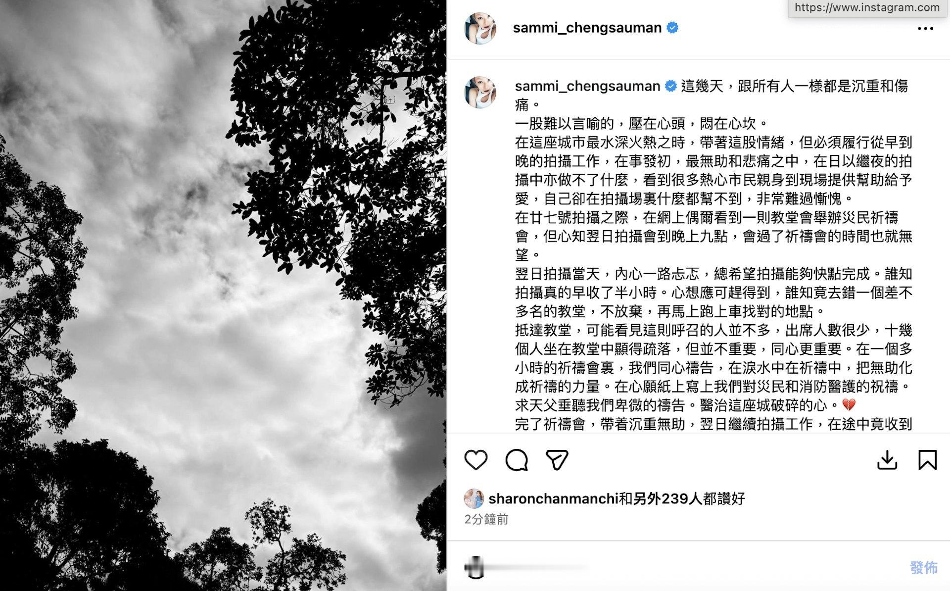 日前大埔宏福苑一场大火,夺走逾百生命,上千人失去家园,震惊全球,香港人笼罩在悲伤之中。身为娱乐圈艺人,大家纷纷有钱出钱、有力出力,希望尽自己的能力帮助灾民。天后郑秀文(Sammi)今日发文,称自己因拍摄工作难以抽身,内心十分难过愧疚。郑秀文在社交平台发文表示,她和全城民众一样,连日来心情始终沉重又悲痛,心里压着一股难以言说的闷气。面对近期发生的这场灾难,她虽然不得不从早到晚完成拍摄工作,却始终心系灾民,还分享了自己如何克服重重困难,将这份无助转化为祈祷的力量。郑秀文提到,在整座城市深陷水深火热之际,她仍得夜以继日地投入拍摄。火灾发生初期,她满心无助与悲痛,看到许多热心市民亲自前往现场伸出援手、奉献爱心,自己却被困在拍摄场地,“什么都帮不上,心里特别难过愧疚。” 这种身为公众人物却无法第一时间提供援助的矛盾心情,让她内心备受煎熬。就在郑秀文为此纠结不已时,她偶然在网上看到一则召集大家参加灾民祈祷会的消息。她明知第二天的拍摄要持续到晚上九点,很可能会错过祈祷会,但心里一直忐忑不安,暗自盼着 “拍摄能早点结束就好了。”令人意外的是,第二天的拍摄居然提前半小时收工了!她立刻动身赶往祈祷会举办地,谁知竟走错了一家名字相近的教堂。但她没有放弃,马上上车去寻找正确的地点。最终赶到教堂时,现场参会的人并不多,只有十几位,但郑秀文强调,大家心意相通才最为重要。在这场时长一个多小时的祈祷会上,郑秀文和一众教友一同虔诚祈祷,“在泪水里、在祈祷中,把无助化作了祈祷的力量”。她们还在心愿纸上写下了对灾民、消防人员和医护人员的祝福与祷告:“求天父垂听我们卑微的祷告,治愈这座城市破碎的心。”