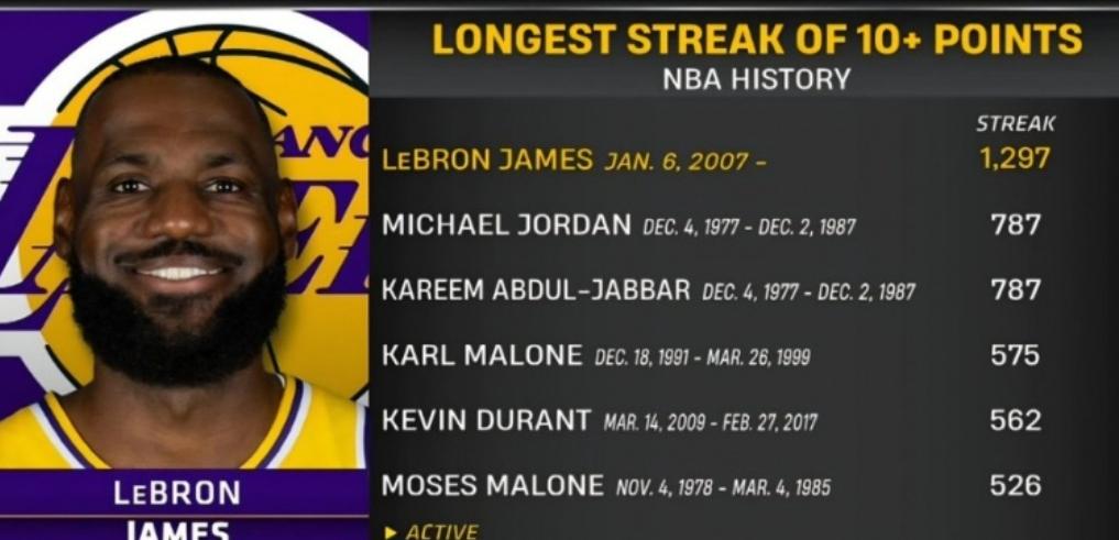 詹姆斯再次刷新得分上双的恐怖记录,已经连续1297场得分上双,湖人媒体惊呼:这是NBA最难打破的记录没有之一!! 仔细研究就发现,这个记录确实不会被打破了,原因有三: 第一,至少要打够1300场以上! 第二,身体要好,耐操,不要总受伤! 第三,也是最重要的,不要脸,脸皮要够厚,不刷10分不下场![看]