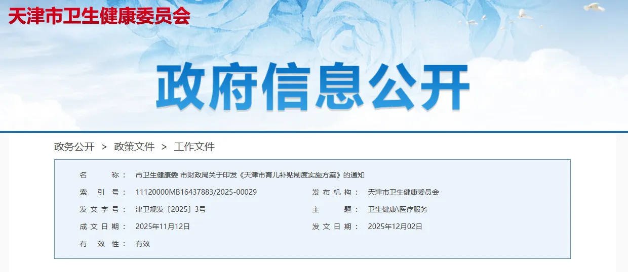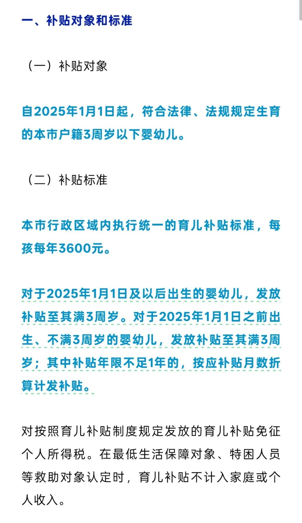 天津育儿补贴方案来了12月2日,天津政务网发布《天津市育儿补贴制度实施方案》,其中明确,自2025年1月1日起,符合法律、法规规定生育的本市户籍3周岁以下婴幼儿享受本市行政区域内执行统一的育儿补贴标准,每孩每年3600元。