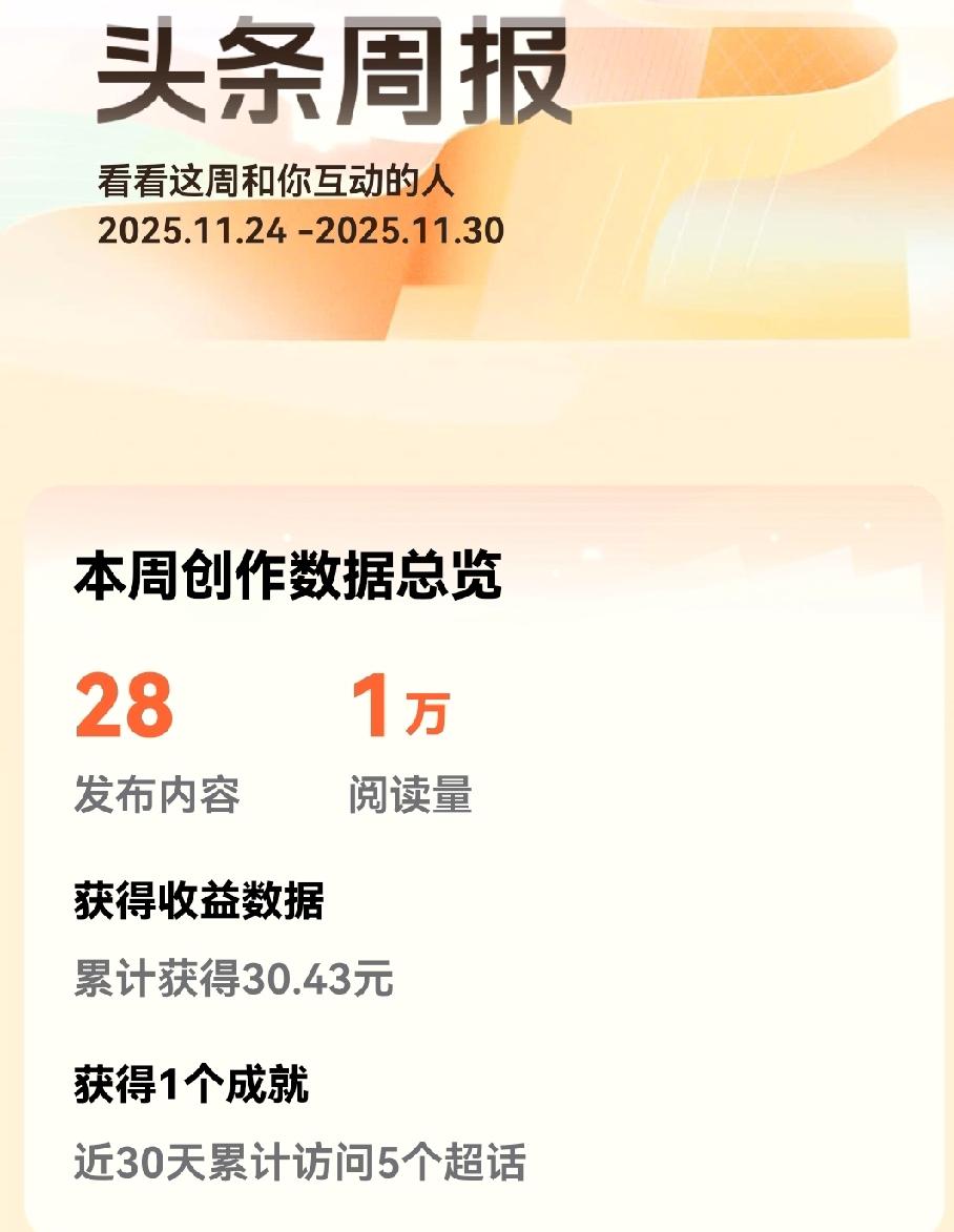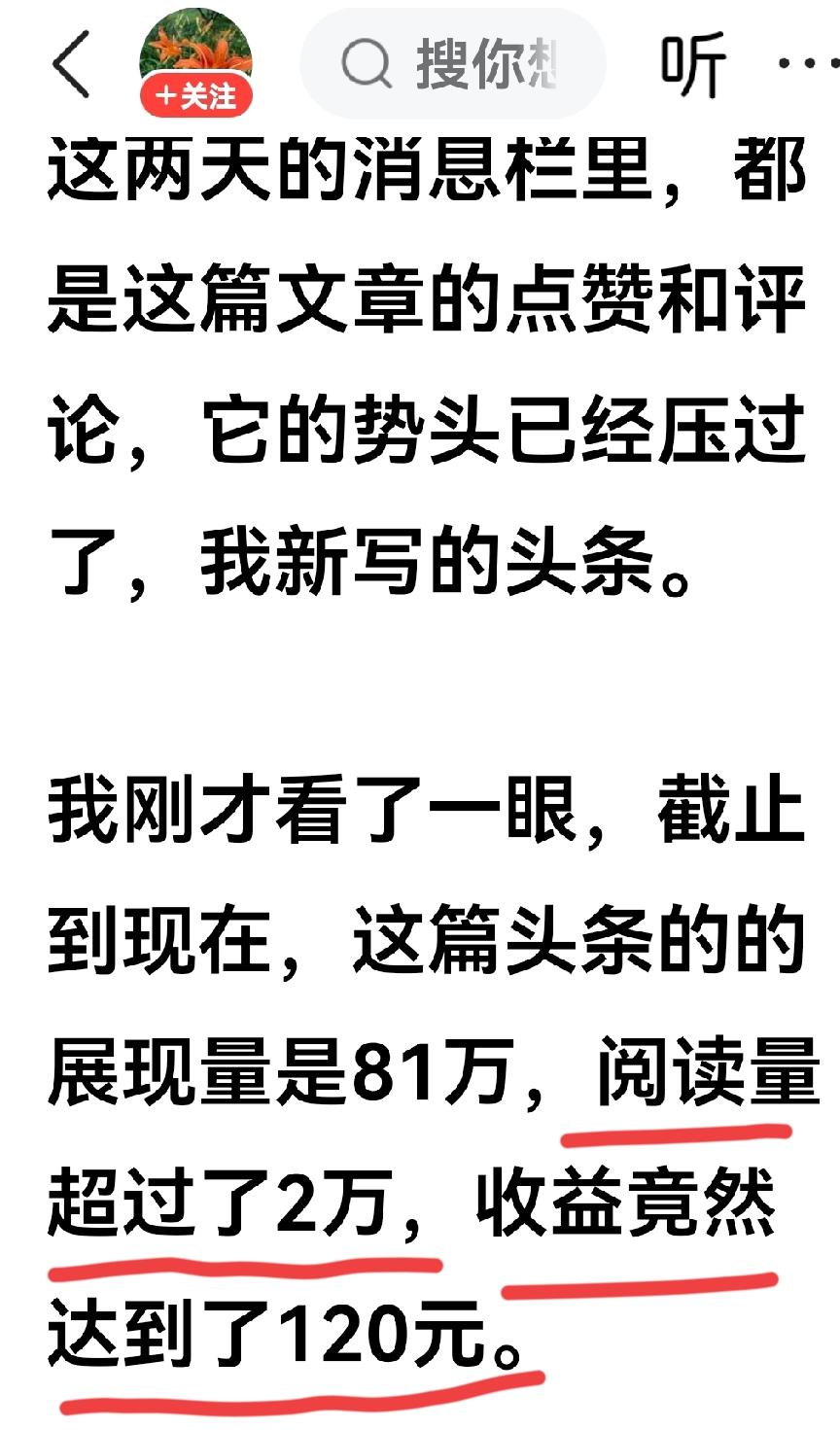 我的头条周报出来了,数据羞羞的!有些拿不出手,但又觉得其中有亮点,所以还是决定拿出来晒一晒。 上周我的总阅读量数据仅仅一万,但总收益头条给得还算不错,直接给了30.43元。 一万的阅读量,头条给了30余元,我上周的阅读收益单价是3元,而这个3元我觉得很亮眼。 抱着这份喜悦,我又开始刷头条了,一位宁静的红7788的作品映入我的眼帘。 宁静的红在微文的开头说,不受头条推荐的作品千万别删除,就是这样的作品说不定几天过后,会给你带来大惊喜! 出于好奇,看看是怎样的惊喜!我毫不犹豫的点了进去,直接欣赏了起来。 宁静的红说,他的那篇惊喜文章因为当时评论区出现了不同的声音,头条又不肯推流,他几乎准备好了要“枪毙”它的,但不知道是何原因,他最后还是没有那么做,及时踩住了刹车。 宁静的红说这一脚急刹踩得好!留住了作品,也给他带来了惊喜与丰厚的回报,昨天,那篇不被人看好的微文,竟然突然爆了,展现量超80万,阅读量2万,头条大手笔,直接给了她120元的劳动报酬。 看到这里,突然震惊了我! 震惊我的不是宁静的红的作品突然爆了,而是一组数据让我吃惊! 2万的阅读量,给了120元的薪酬,这阅读单价也太高得离谱了,达到了6元,这么高的收益单价刷新了我的认知。 说到这里,不知友友们的感觉如何?有没有被震惊到? 这段时间,我的微文几乎就没有离开过对收益单价的讨论,而且我对头条给予我的平均3元的收益单价比较开心,原来我错了。 我是一只青蛙,只能看到井口那么大的天,哪里知道天很大,大得无边无际!