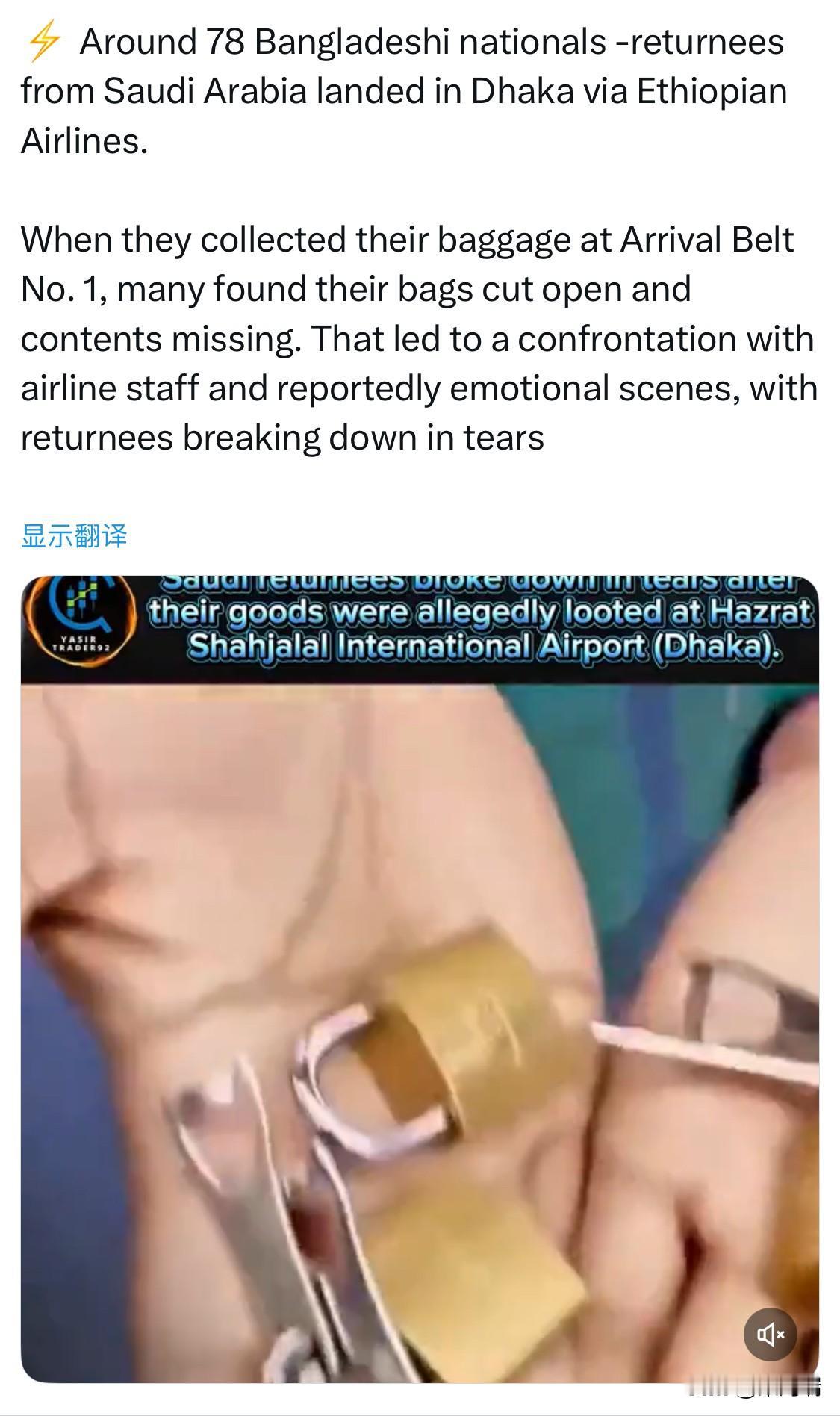 11月14日,约 78 名从沙特阿拉伯返回的孟加拉国国民乘坐埃塞俄比亚航空公司的飞机抵达达卡。 当旅客在1号到达传送带领取行李时,许多人发现自己的行李被割开,里面的东西不见了。这导致旅客与航空公司工作人员发生冲突,据报道现场气氛一度十分紧张,一些返程旅客甚至崩溃痛哭。 孟加拉国民航局和航空公司官员澄清称,行李物品丢失的问题源于国外(沙特阿拉伯)的行李整合和处理程序,而非达卡机场工作人员或航空公司的不当行为。