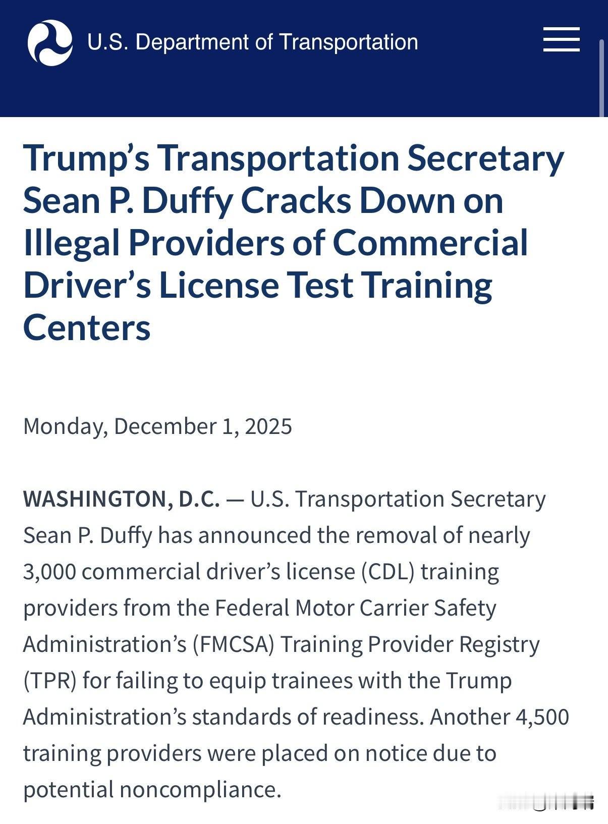 突发新闻:审计发现 44% 的卡车驾驶学校不符合联邦规定。 美国交通部长肖恩·达菲今天宣布,3000所CDL培训学校已不再列入联邦培训提供商名录,另有4500所学校已收到通知。