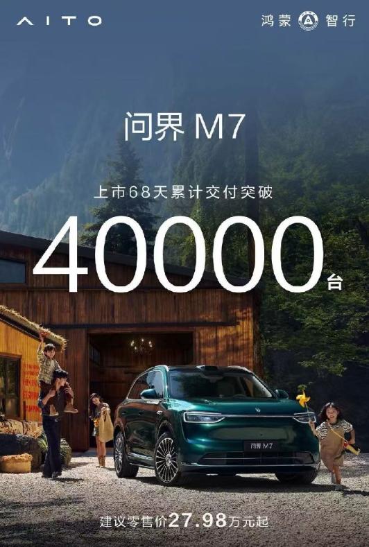 全新问界M7(27.98万元起)上市68天,交付破4万台(新增1万仅用11天)。 盘一下几个关键节点: 上市21天交付破万 上市36天交付破2万 上市57天交付破3万 官方曾表示,全新问界M7上市41天累计大定破9万台,得有不少用户明年才能提车了。