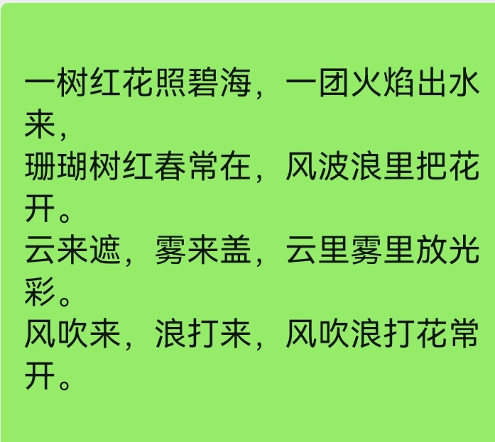 一树红花照碧海,一团火焰出水来,珊瑚树红春常在,风波浪里把花开。云来遮,雾来盖,云里雾里放光彩。风吹来,浪打来,风吹浪打花常开。
