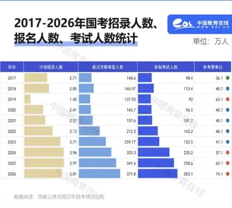 你信吗?如今想端上“铁饭碗”,难度比考985还大!刚结束的2026年国考,371.8万人抢3.81万个岗位,平均74人争一个职位,真正的百里挑一。 这阵势,堪比当年千军万马过独木桥的高考。可为啥大家一窝蜂去考公?说白了,在几乎人人都是大学生的今天,文凭含金量缩水,找个好工作太难了。公务员稳定,有保障,成了无数人,尤其是普通家庭孩子眼中阶层跃升最实在的通道。 今年政策还给了点希望。报考年龄上限从35岁放宽到38岁,应届硕博甚至到43岁。一些本已超龄的考生,终于又搏了一次机会。 但别光看贼吃肉,不见贼挨打。公务员早不是一张报纸一杯茶的清闲差事,997式加班是常态,且没有加班费,压力不小。更扎心的是,别看报名人多,近两年实际参考率只有86%左右,说明不少人是随大流凑热闹,水分不小。 所以啊,国考热背后,是年轻人对安稳的渴望,也是面对现实的无奈选择。但这条路注定拥挤,是否适合自己,还得掂量清楚。毕竟,真正的“铁饭碗”,不是一辈子在一个地方吃饭,而是走到哪儿都有饭吃。