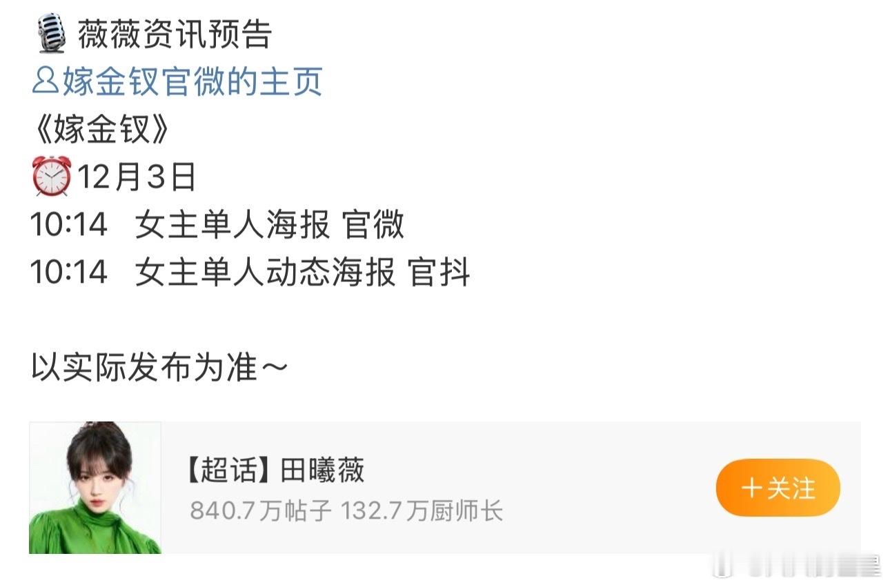 好期待!嫁金钗官宣预热田曦薇嫁金钗宣发预热