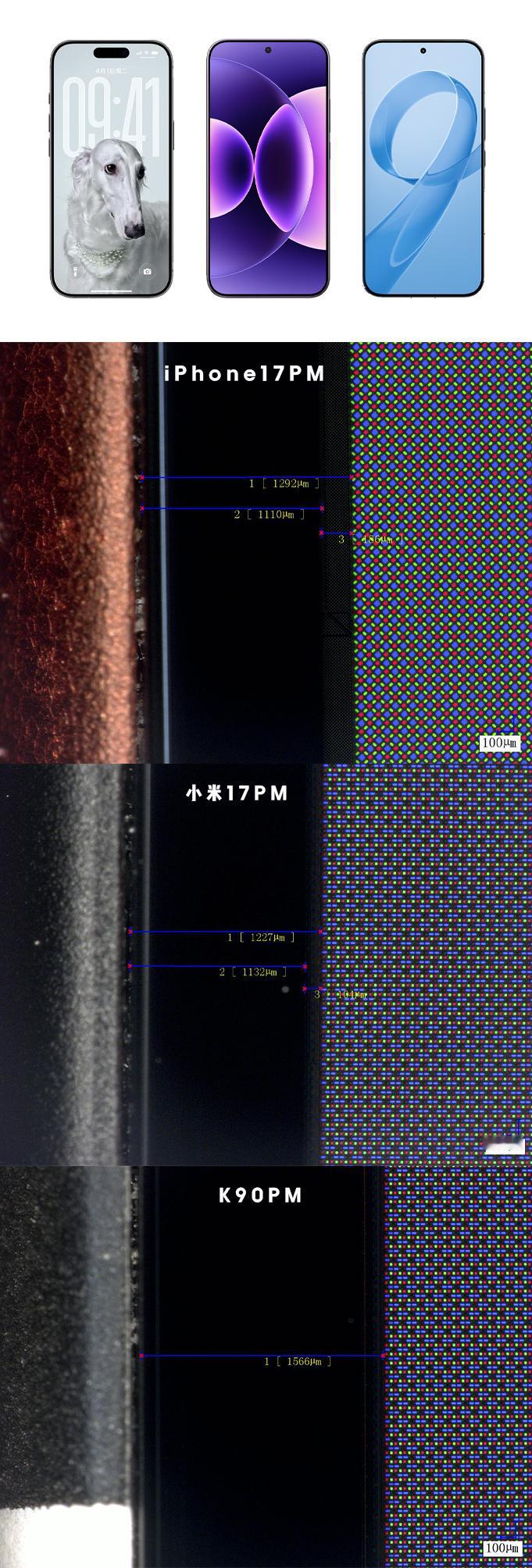 3台ProMax下巴宽度对比!iPhone17PM 1.292mm,小米17PM 1.227mm,K90PM 1.566mm。你在用哪个?