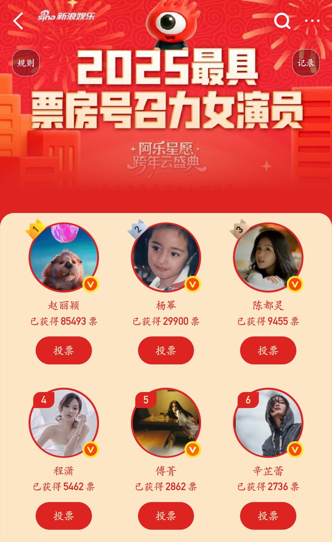 2025最具票房号召力女演员投票TOP6赵丽颖、杨幂、陈都灵、程潇、傅菁、辛芷蕾