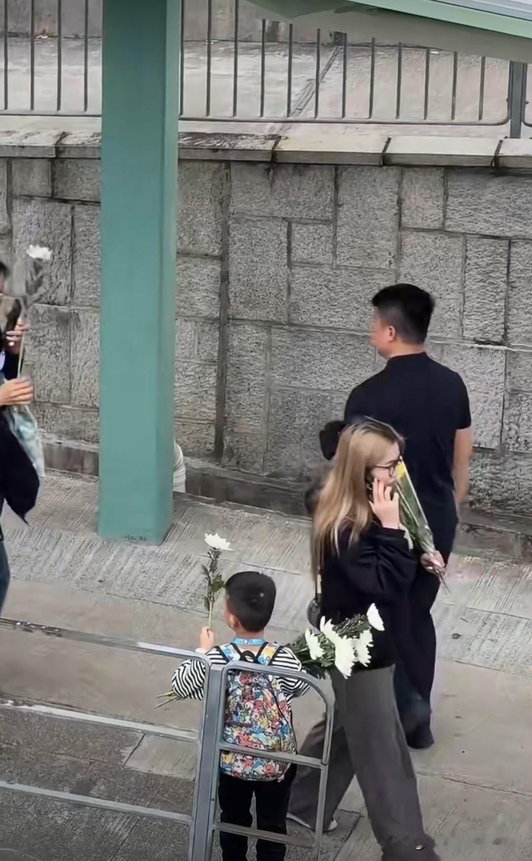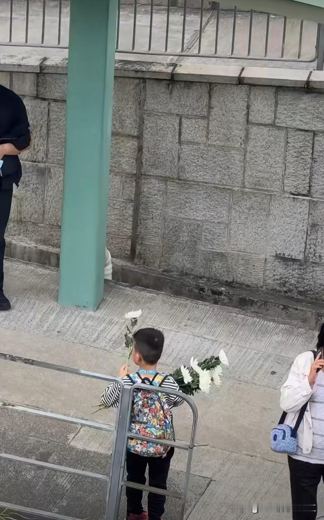 今日,在灾区献花的人依然络绎不绝。 一位小朋友拿着花,给还没准备花的人们,他静静站着等待,这一幕给经过的巴士乘客拍下来。