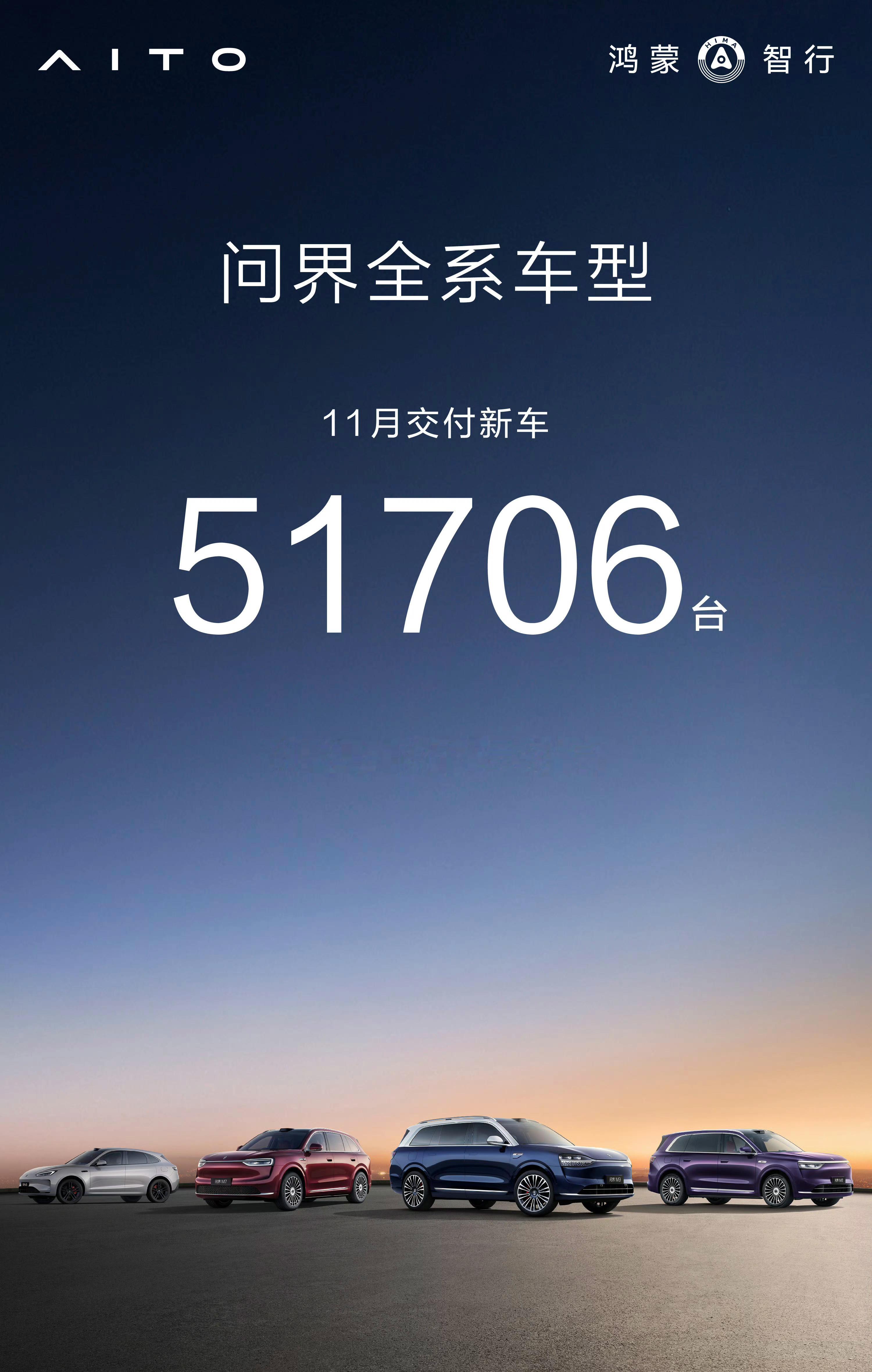 问界11月交付51706台,历史新高成为继理想、零跑之后,第三个单月突破5万的新势力品牌
