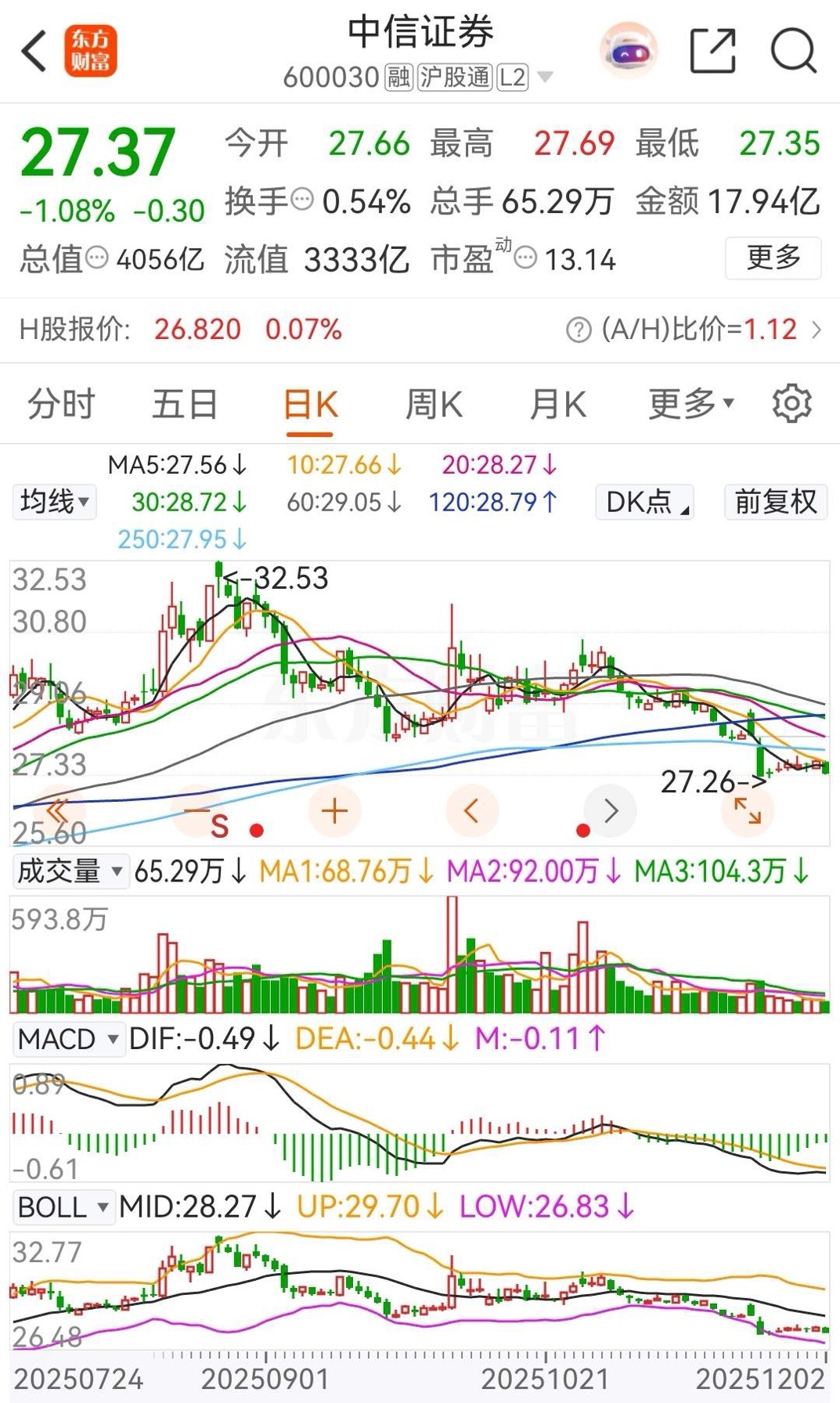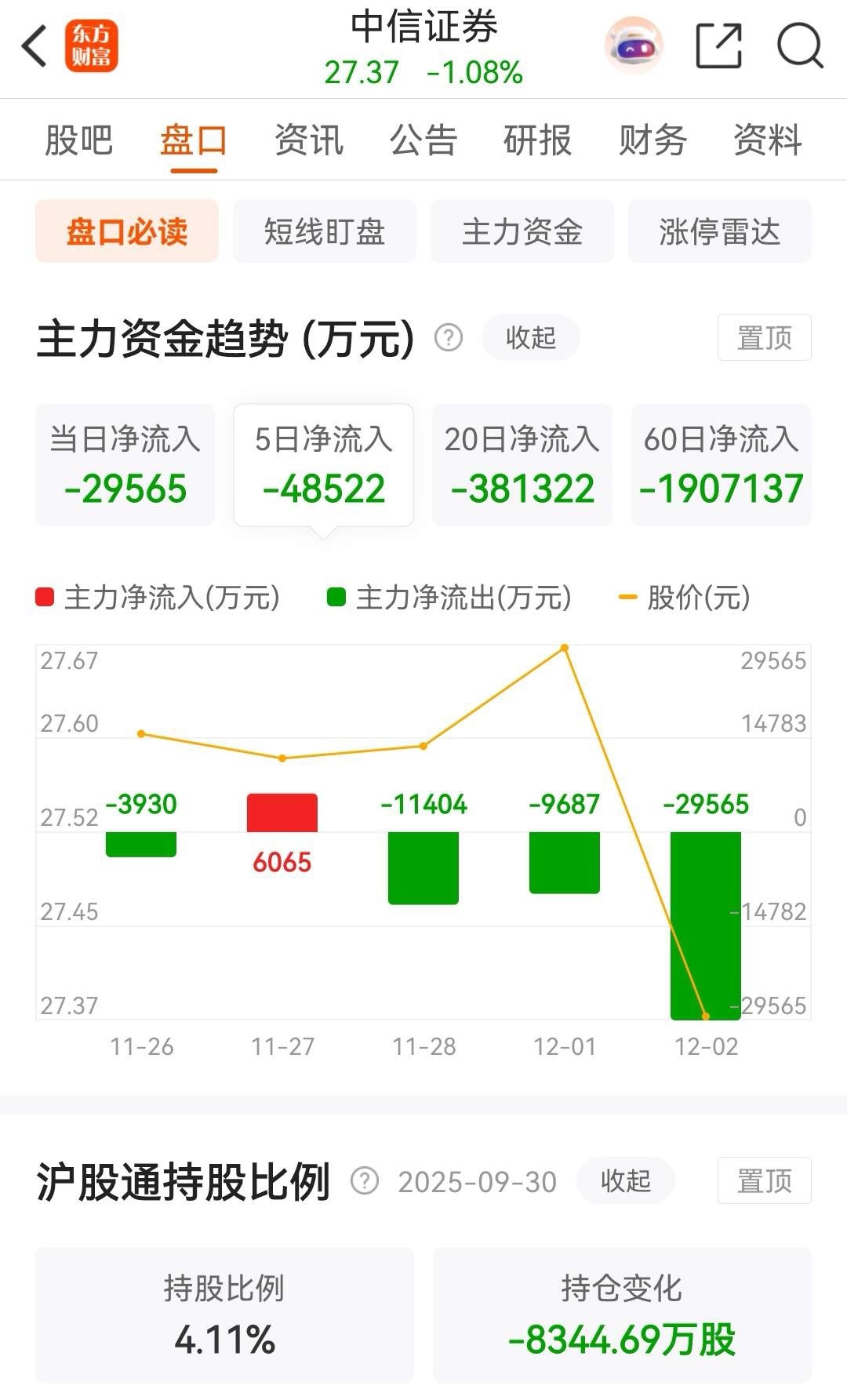东方财富和中信证券今天低开低走,分别下跌了2.08%和1.08%,其中东方财富更是连续13天都被主力资金净卖出,而中信证券则是连续三天被主力资金净卖出。东方财富今天早盘低开后一路震荡走低,几乎以最低价报收,股价也是创出了本轮调整新低,今天的下跌幅度为2.08%,收盘报价22.61元,成交金额为为53.26亿元。在资金流向上,今天被主力资金净卖出了8.5714亿元,目前已是连续13个交易日被主力净卖出了,近五个交易日得净卖额为 24.2852 亿元,而近20个交易日得合计净卖出金额为76.08亿元。从走势上看,本周前两个交易日均以下跌为主,已经打破了上周在低位横盘整理的态势,再次破位下行。中信证券今天同样是低开低走,收盘时下跌了1.08%,收盘报价为27.37元,全天的成交金额为 17.94 亿元,已经缩小到了极致。在资金流向上,今天被主力资金净卖出了2.9565亿元,目前是连续三天被主力资金净卖出,近五个交易日得合计净卖出金额为4.8522亿元。从走势上看,目前依然是在低位缩量横盘整理。至于更详细的技术分析,可以查看上一篇中关于券商概念板块走势的技术分析。对于东方财富与中信证券,这对券商“双巨头”近期走势背离业绩的诡异现象,正在引发市场对“估值陷阱还是黄金坑”的激烈博弈。从业绩和近期走势上看,三季报亮眼但股价年内下跌。下面是详细情况!1、中信证券:2025年Q3净利润94.40亿元创历史新高(同比+51.54%),前三季度总资产突破2万亿元,成为国内首家资产规模破2万亿元的券商。但是年内股价跌幅却高达5.26%,月线三连阴。2、东方财富:Q3净利润35.3亿元(同比+77.74%),增速领跑头部券商,轻资产模式净利率高达 74.58% 。然而年内股价的跌幅却是高达12.23%,11月单月的跌幅为8.24%,月线同样也是三连阴,且今天股价再创本轮调整新低价。