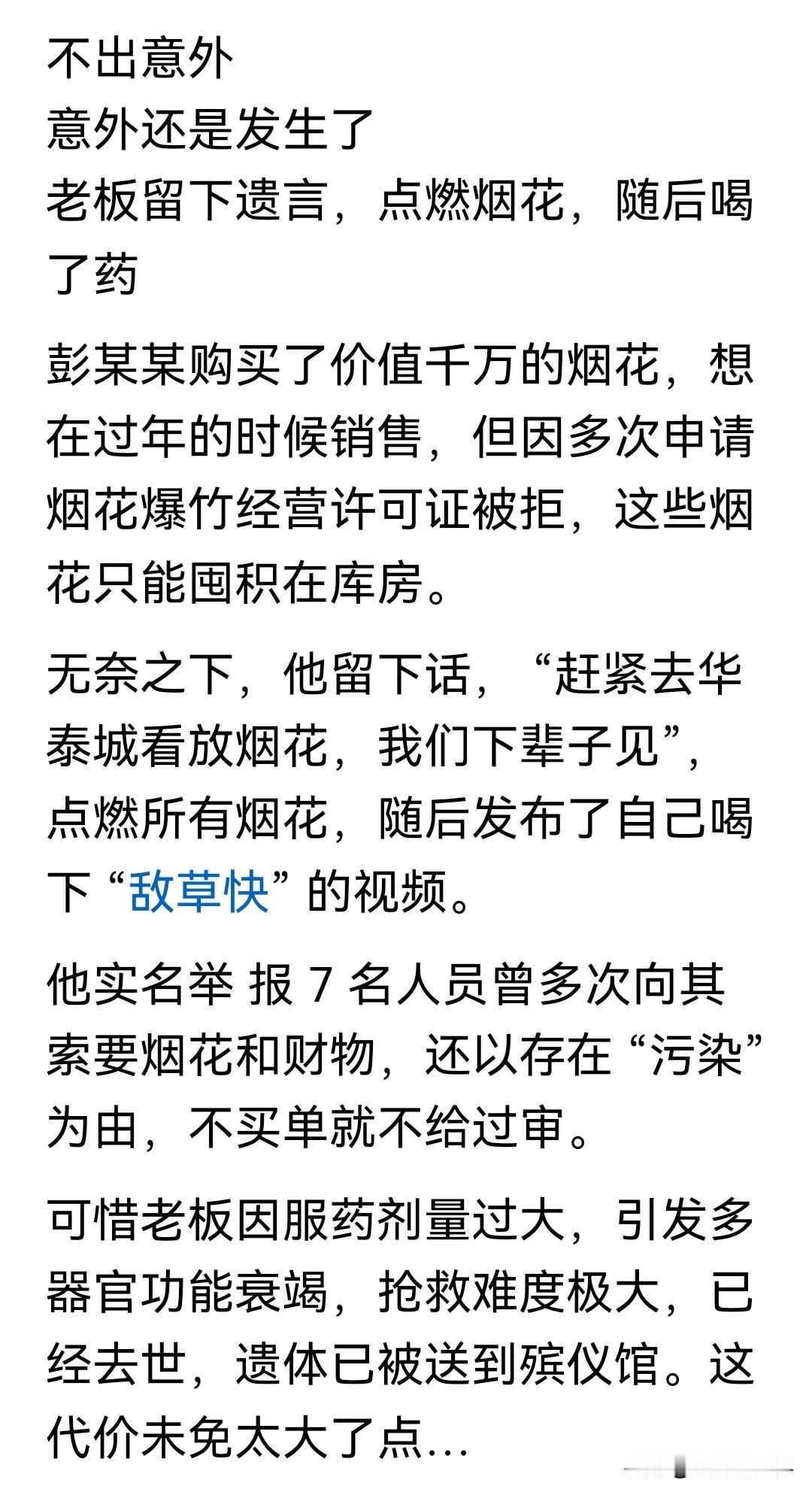 “富贵险中求”是没错,殊不知却很多时候是富贵求不到,人在险中亡! 敢囤1000万的烟花,原本想趁着过年大赚特赚一把,但没成想证却(听说是“续证)迟迟办不下来,没了退路的他,最后毅然决然选择以死实名举报不让他办证的人! 贩卖烟花爆竹,本身就是一件挺险的事情,当然风险大收益也大,那些大胆的人也为此豁出去了,当没给自己留退路时,一旦前路不通就只能走极端了! 其实在现在这个世道,胆子小一点,谨慎一点,孤注一掷时依然不忘给自己留一条退路,也未必不是一件好事[击掌]