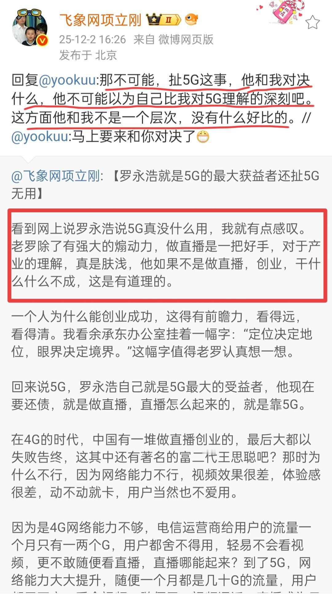 项立刚自言不惧罗永浩。近日,罗永浩先生评价5G真没什么用。这话被项立刚先生知道了。项先生一听到此言,气不打一处来。项立刚批评罗永浩对于5G的理解是肤浅的,做直播倒是一把好手,创业也是干不成的。 随后,项立刚从5G应用等方面来反驳罗先生的话,也强调了5G的重要性。 有网友给项立刚留言说,马上要来和你对决了。 项主刚回答说,在5G方面,罗永浩的理解没他深刻,也根本不在一个层次,还对决什么? 由此看来,项立刚不惧罗永浩的反击。 倘若这次罗永浩先生回应了项立刚,希望双方接下来的对话要友好交流。