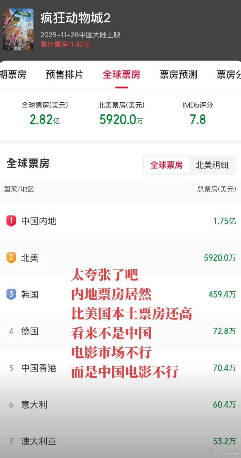 《疯狂动物城2》内地票房比美国本土票房还高疯狂动物城2排片量