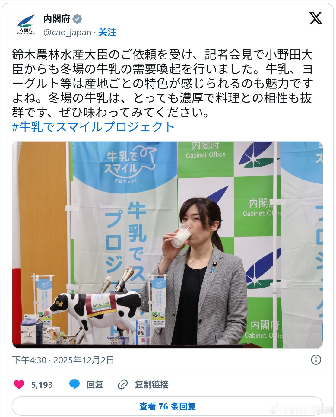 【日本大臣记者会上“豪迈一喝”爆红!网赞:史上最强带货】海外新鲜事日本 42岁的日本经济安全保障担当大臣小野田纪美,因其美日混血背景及过去担任模特儿的经历,在上任前就备受关注。上任后,她以直率、不做作的风格进一步走红,被视为日本政坛新星。今天她在记者会上替农民推广牛奶,并豪爽地一口喝干,相关画面在网络上疯传,不少网友直呼这是“最强带货现场”。据日本媒体报道,日本每到冬季牛奶销量都会下滑。今日内阁会议后,小野田纪美突然对记者说:“有件事想拜托大家!”随即拿起桌上一杯牛奶,大口喝下并发出爽快的“哈”声。她表示,这杯牛奶来自她的家乡冈山。天气变冷后,牛奶销量大减,虽然滞销牛奶可以改做酸奶,但近年来酸奶需求也在下降。小野田纪美坦言,这原本不在她的职责范围内,但她受农林水产大臣拜托,希望借着在镜头前喝牛奶、吃酸奶,带头支持农民。记者们也被她豪爽的举动逗笑,现场气氛轻松。相关影片随即在 X(原推特)上爆红,也被不少台湾网友转发。网友留言称:* “这是最佳带货现场”* “太豪迈了”* “这届内阁成员真的很有趣,不像以前那么死板”* “气场十足又接地气”* “第一次看到内阁记者会还能顺便带货,全球独一份”图1:日本经济安全保障担当大臣小野田纪美。 (彭博)