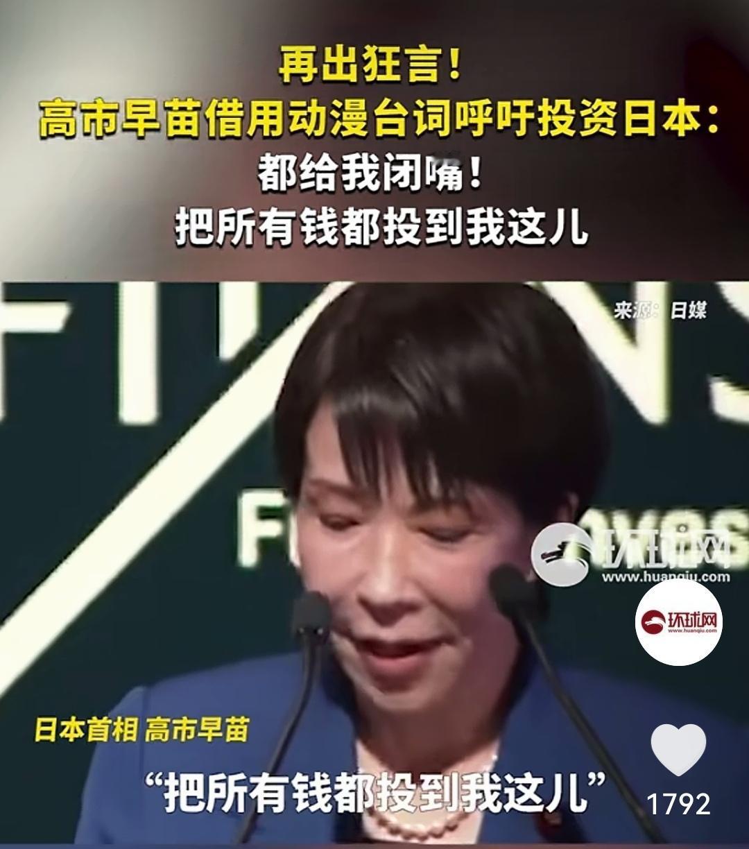 都给我闭嘴,把所有的钱都投到我这儿! 高市早苗到底是真无知还是假聪明?这话也能说出来?尽管是借用的台词。 投资家听到这话,只能是一句话:恶心死我了!