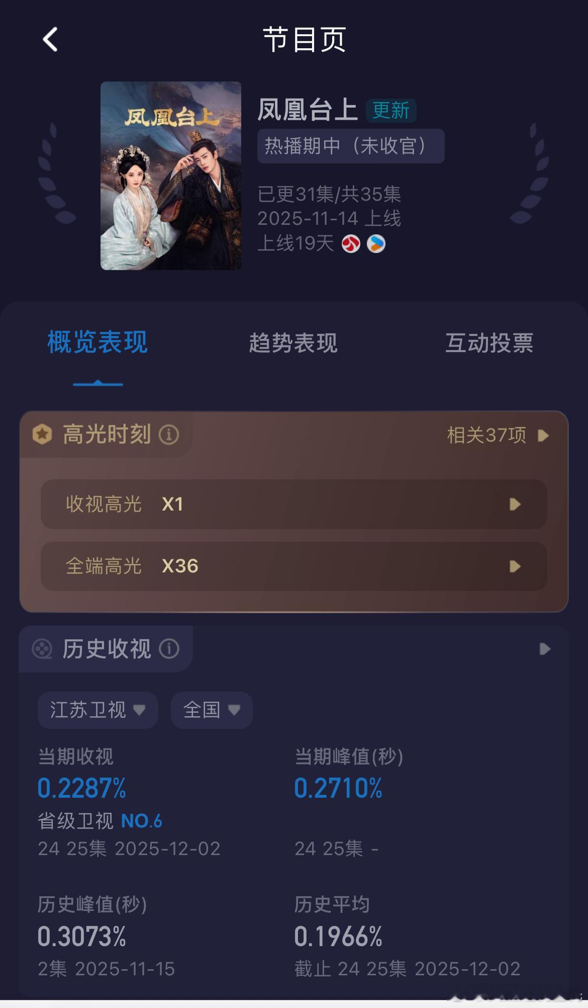 任嘉伦、彭小苒凤凰台上 超点完结优酷热度最高9224,实时7454招商7品牌,27广,总时长230s,🥕×211-25集酷云集均收视率0.1966凤凰台上be