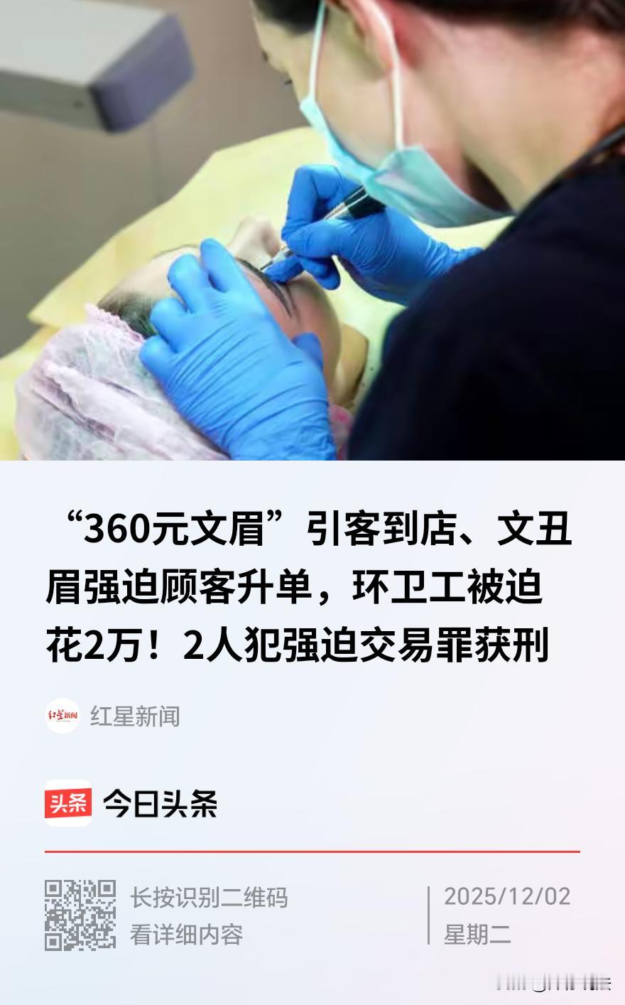 广州,一女子是一名月薪四千的环卫女工,本想花几百块去某美容店做眉毛,可一旦躺上操作床,事情就变了味。店员会先草草画个难看眉形,接着便围上来施压:“便宜的做了丑,不做完没法出门!”从顾问到店长轮番上阵,女子连上厕所都被紧跟。更过分的是,操作时故意少用麻药、换粗针,让女子疼得受不了。结果,女子被半强迫地刷光积蓄,付了两万元。案发后,警方介入调查,发现受害者高达38人,遭遇雷同,都是先以“360元特价文眉”吸引到店,再通过强迫服务、暴力或软暴力等方式升级套餐至数千元甚至数万元…… 据悉,这起案件始于网络平台上那些制作精良的短视频广告,诸如“360元精致文眉”、“460元明星同款眉形”……这些远低于市场行情的价格,像诱饵一样精准地投放给潜在的消费者。 被害人陈某某就是其中一位,她通过手机刷到了广告,看到300多元的价格,觉得可以尝试,便按照地址找到了门店。 和她一样,还有37名被害人,最初都是被这样的低价承诺吸引而至。 涉案门店装修时尚,员工统一身着黑色工装,显得专业而整洁,前台热情接待,顾问嘘寒问暖,从拉家常开始,试图迅速拉近与顾客的距离。 这一切流程化的服务,起初让顾客放松了警惕。然而,这标准化服务的背后,是一套经过培训的、以升单为绝对目标的剧本。 当顾客表示想要做广告中的特价眉毛时,陷阱的齿轮开始严密转动,纹绣师会先为顾客设计眉形。 关键一步在于“定型”即用眉笔或类似材料将设计的眉形固定在顾客眉部。 一旦定型,短时间内难以彻底清除。此时,纹绣师会展示两种效果:一种是粗糙、不美观的“特价眉”效果图或直接在顾客脸上画出丑眉,另一种是精致、自然的“高价眉”效果。 被害人张某甲,一名月薪仅4000余元的环卫工人,回忆道:“我本来只想做398元的,躺下后她们给我画了两条特别粗、特别难看的眉毛,我一看就不想要了。” 但此时,纹绣师和顾问会告知,眉毛已经定型,如果不继续做完,顶着这样半成品或难看的眉形根本无法出门。 如果顾客仍不妥协,接下来的手段更为不堪,在做特价眉时,少涂抹缓解疼痛的舒缓膏,甚至将专业纹绣针替换成更粗、更痛的钢针,人为加剧顾客的痛苦。 然后,工作人员会告诉顾客:“看,特价的就是这种效果,又疼又丑。” 同时,顾问、店长、纹绣师会轮番上前,采用话术进行游说、吓唬和引导,他们营造出一种“不选贵的你就无法见人”的焦虑氛围。 更可气的是,甚至可能限制自由,陈某某陈述,她从上午10点多到晚上,除了上厕所就没从床上起来,期间上厕所也有女的跟着。 当顾客在疲劳战和心理攻势下防线松动,同意“升单”后,面对动辄数千元甚至数万元的高额费用。 被害人邓某甲的遭遇堪称“糊里糊涂”,她在半推半就间,竟然被扫码支付了40286元,回到家才发现。 在这套组合拳下,受害者们纷纷掏空了钱包,陈某某最终从微信绑定的两张银行卡转出14800元,并开通花呗被扣款15000元,凑齐了29800元的“套餐”。 环卫工张某甲,被迫支付了相当于她五个月工资的20000元。 2024年7月,焦作警方发现了广州这家门店的线索,指定武陟警方管辖此案。 经过侦查,检察机关对门店的两名关键人员顾问艾某和刘某甲提起了公诉。 法院会如何判决呢? 《刑法》第二百二十六条规定,以暴力、威胁手段,实施下列行为之一,情节严重的,处三年以下有期徒刑或者拘役,并处或者单处罚金……(一)强买强卖商品的;(二)强迫他人提供或者接受服务的;…… 法院指出,涉案人员艾某、刘某甲通过上述语言威胁、心理施压、跟随监视、恶意制造痛苦等系列行为,形成了一种足以使普通消费者产生恐惧、紧张、无助心理,进而不得不违背自己真实消费意愿的强制性氛围,符合强迫交易罪中“威胁手段”。 经过核查,被告人艾某在担任顾问期间,参与强迫22名顾客接受高价服务,涉案金额达422,806元,个人获利12,684元。 被告人刘某甲在担任纹绣师及顾问期间,参与强迫17名顾客接受高价服务,涉案金额总计327,822元,个人获利8,940元。 不过,《刑法》第二十七条规定,在共同犯罪中起次要或者辅助作用的,是从犯。对于从犯,应当从轻、减轻处罚或者免除处罚。 法院进一步指出,艾某、刘某甲作为门店的“顾问”,其主要职责是按照公司及店长的安排,在具体的顾客接待过程中实施胁迫性推销,在整个犯罪链条中起次要作用,系从犯,依法应当减轻处罚。 法院认为,鉴于二人到案后能如实供述罪行,构成坦白,且自愿认罪认罚,积极退缴全部违法所得并预缴罚金,依法可从轻处罚。 最终,法院判处艾某有期徒刑一年四个月,并处罚金人民币一万五千元;判处刘某甲有期徒刑一年四个月,并处罚金人民币一万五千元。 对此,您怎么看?