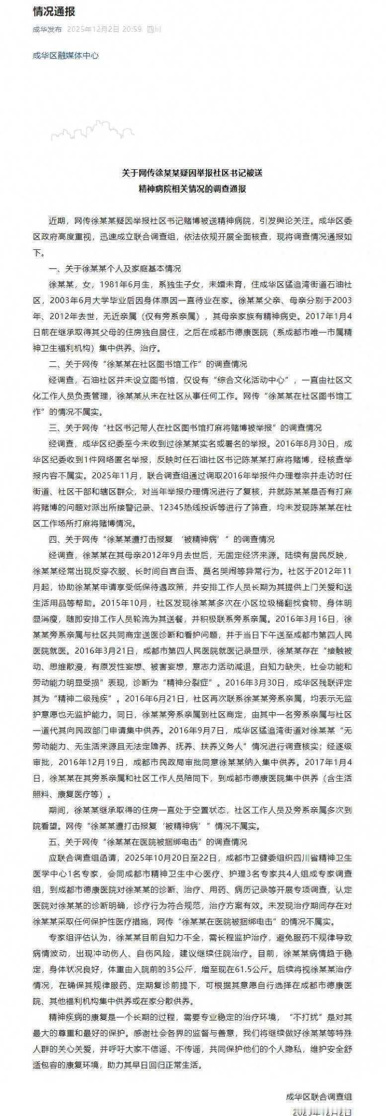 “举报社区书记赌博反被送精神病院”——近日引发全网热议的成都徐某某事件,终于有了权威结论。12月2日晚,成都市成华区联合调查组发布详细通报,明确网传“举报遭报复”“被捆绑电击”等三大核心说法均不属实,还原了事件背后的真相。 通报披露,徐某某生于1981年,2003年大学毕业后因身体原因待业,父母早年相继离世,仅有旁系亲属且母亲家族有精神病史。2012年其母亲去世后,徐某某无固定经济来源,陆续出现反穿衣服、自言自语、莫名哭闹等异常行为,甚至多次在小区垃圾桶翻找食物,身体明显消瘦。社区从2012年起便为其申请低保,长期提供上门关爱和送餐服务,并非网传“在社区图书馆工作”——事实上该社区从未设立图书馆,仅有综合文化活动中心。 关于舆论焦点的“举报遭报复”,调查明确成华区纪委从未收到过徐某某的实名或署名举报。2016年曾有一起反映时任社区书记陈某某赌博的匿名举报,经核查及此次联合调查组复核,均未发现相关事实。徐某某的送医过程系旁系亲属与社区共同商定,2016年3月被成都市第四人民医院诊断为“精神分裂症”,同年被评定为精神二级残疾,因旁系亲属无监护能力,经逐级审批后于2017年纳入民政集中供养,进入成都市德康医院接受治疗照料,全程符合法定程序,不存在“被精神病”的情况。 针对网传“在医院被捆绑电击”的惊悚说法,成都市卫健委组织4名精神卫生专家专项调查后确认,医院对徐某某的诊断明确、诊疗规范,未采取任何保护性医疗措施。目前徐某某病情稳定,身体状况良好,体重从入院时的35公斤增至61.5公斤,后续可在确保规范治疗的前提下,根据自身意愿选择供养方式。 调查组在通报中呼吁,精神疾病康复需要专业稳定的环境,“不打扰”是对患者的最大尊重。同时提醒公众不信谣、不传谣,共同保护特殊人群的个人隐私,维护包容的康复环境。这场引发广泛关注的舆论风波,最终以详实的调查数据还原了真相,既回应了社会关切,也彰显了对特殊群体权益的保障与呵护。