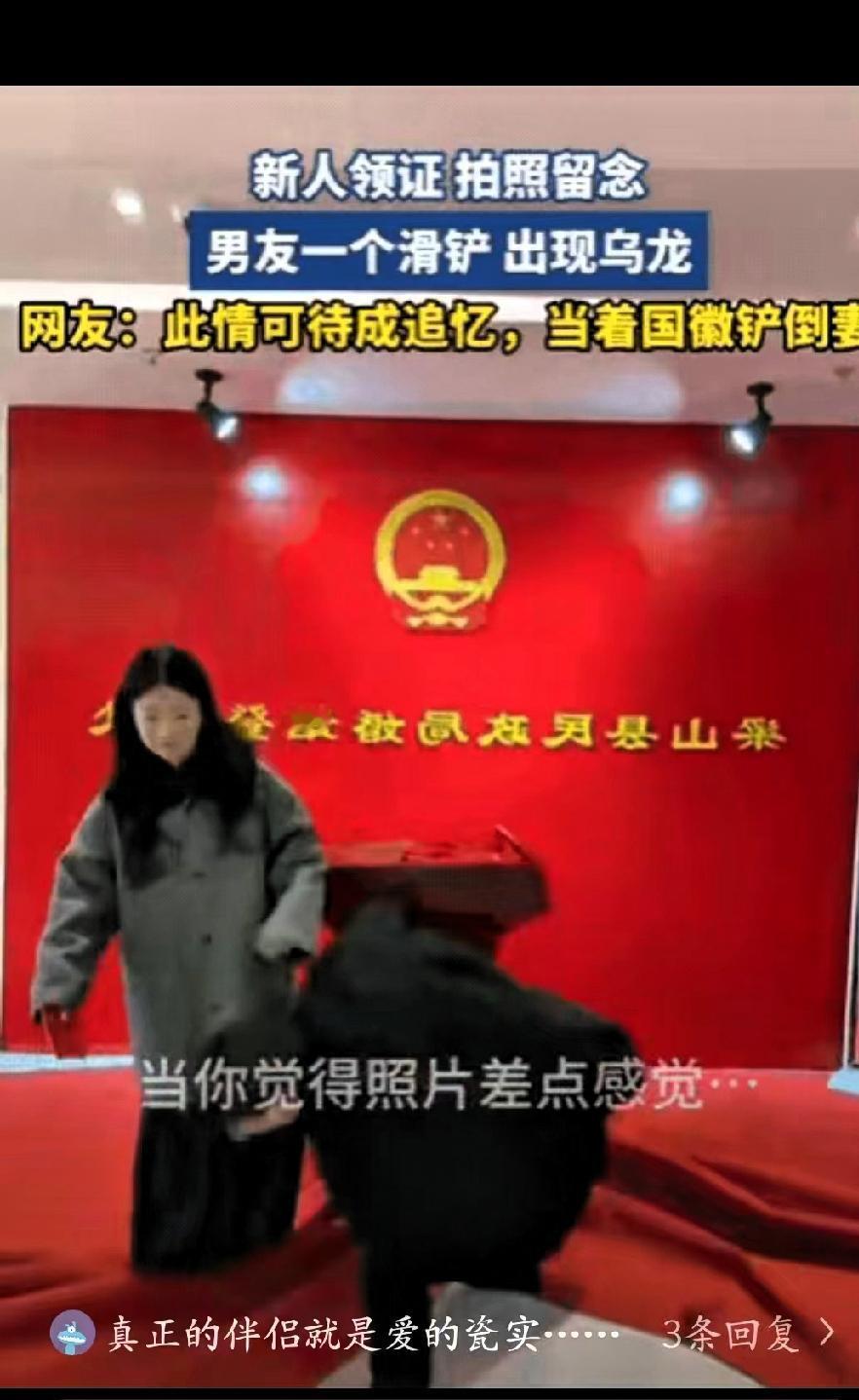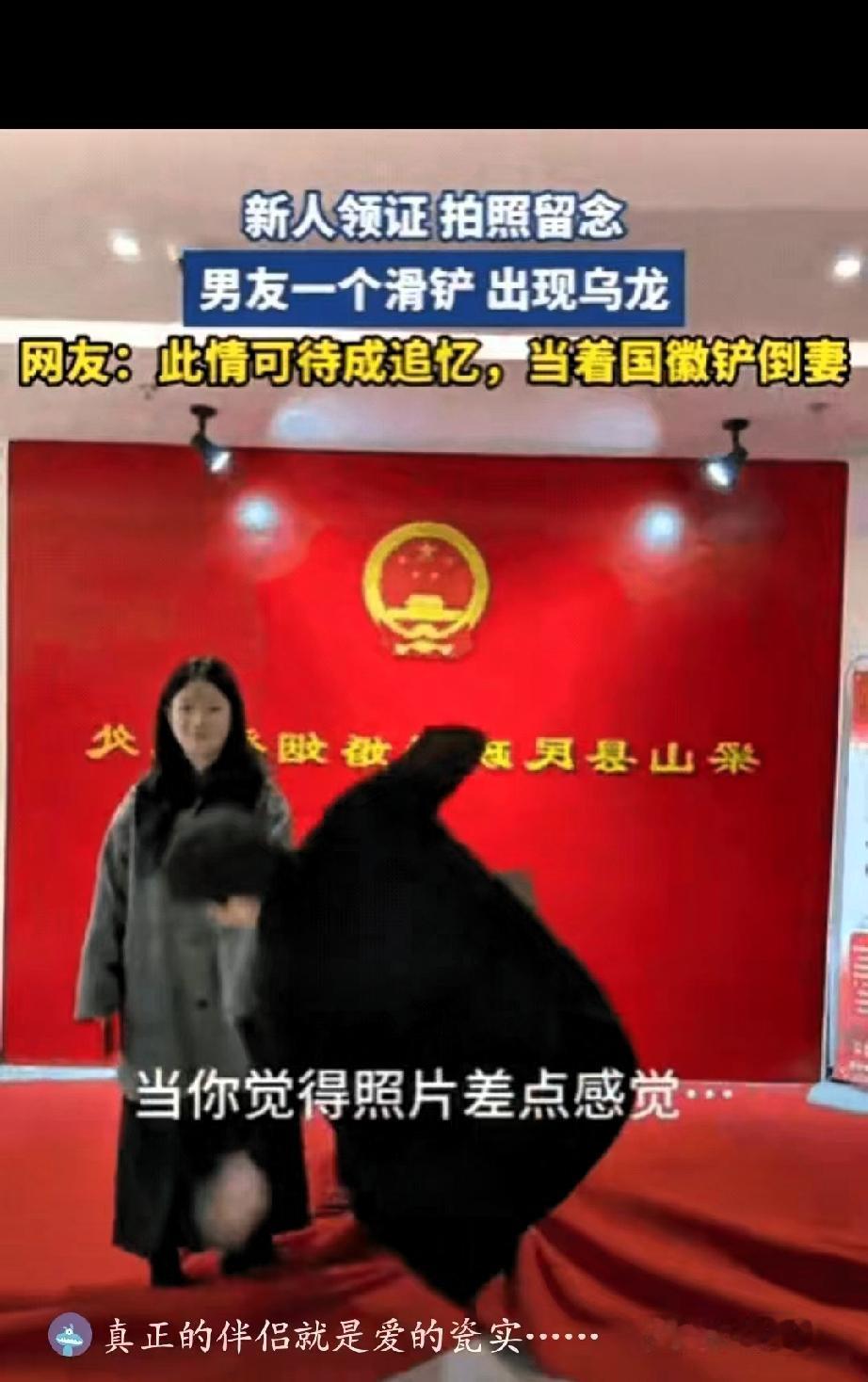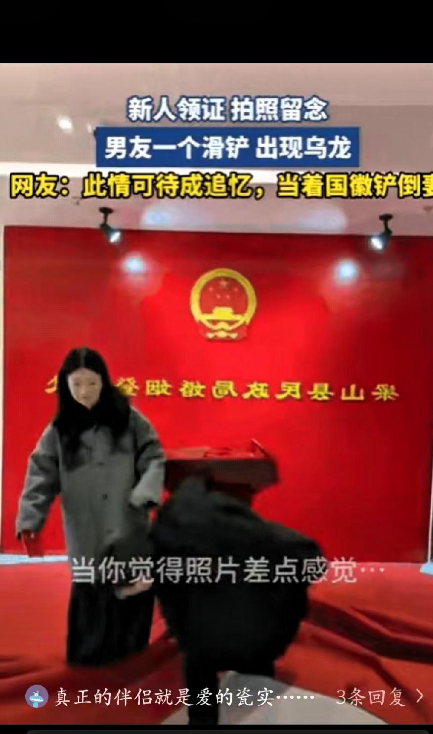 全网都笑喷了:山东,一对情侣在民政局刚领完证,想着一起来个合照。 新郎因为心情激动,脚下没注意红毯的防滑性,不小心滑倒在地,身旁的新娘也被顺带拉着一起摔倒。 好在两人都没受伤,爬起来后看着彼此狼狈的样子,忍不住相视而笑,这一幕被摄影师记录下来传到网上,很快引发热议。网友们纷纷留言,调侃中满是善意,有人说“这是喜极而‘摔’,寓意日子红红火火”,也有人想起了自己领证时的紧张与喜悦。 其实,这看似意外的一幕,恰恰戳中了大家对婚姻的共鸣。现在很多人追求精致的仪式感,拍领证照时反复调整姿势、打磨细节,总想呈现完美的状态。但婚姻本就不是一场完美的表演,更多的是日常里的琐碎与不期而遇的小意外。 就像这对新人,没有刻意的摆拍,没有华丽的修饰,摔倒时的手忙脚乱和起身时的相视一笑,反而更显真情。真正的婚姻,不是永远保持光鲜亮丽,而是遇到意外时,能和身边人一起坦然面对,把小尴尬变成小美好。 那些看似不完美的瞬间,往往藏着最动人的温暖。婚姻的真谛,正是在这样的相互包容与陪伴中,把平淡的日子过出温度。