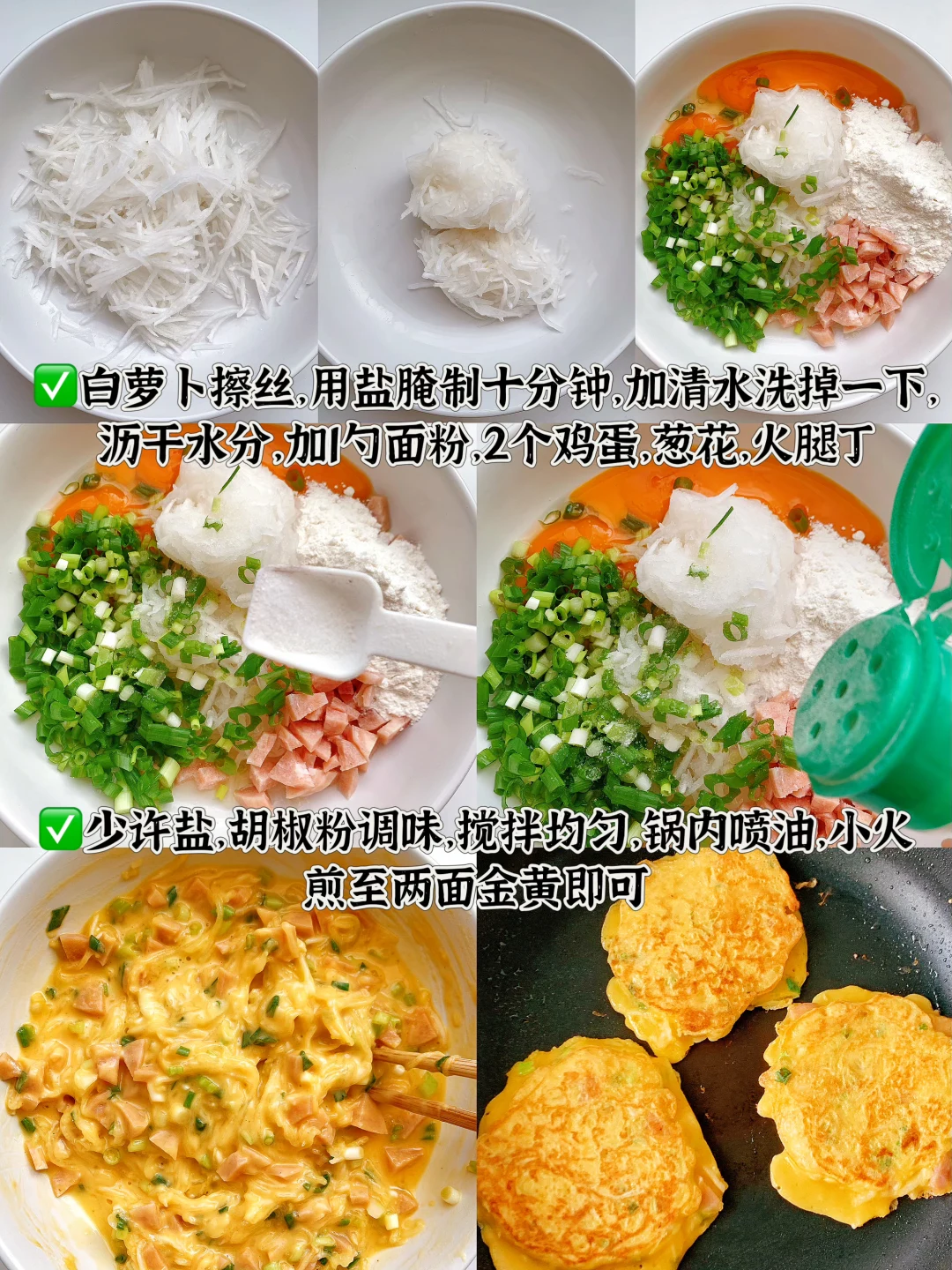 [飞吻R]又来分享了,快手早餐鸡蛋饼,不用和面,手残党也会的鸡蛋饼,香味十足~ 👩🏻🍳今日分享:萝卜丝鸡蛋饼 🛒食材清单:白萝卜 | 鸡蛋 | 面粉 | 葱花 | 火腿肠 做法见上图👆🏻 🕒时间:10-15分钟 [薯券R]难度:⭐